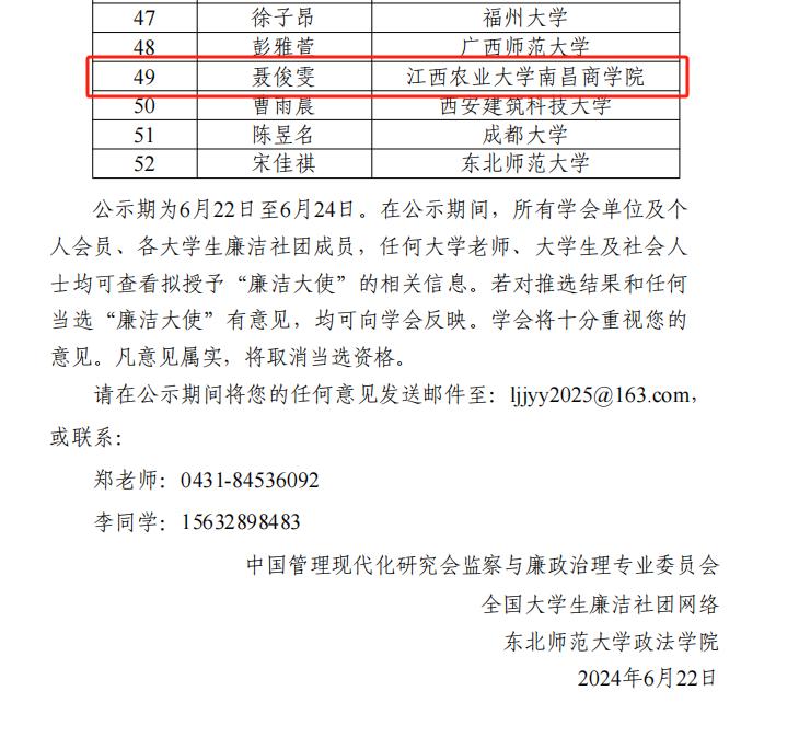 该评选旨在全国高校范围内遴选并表彰德才兼备、积极践行廉洁理念、弘扬清正廉洁风尚的优秀学生代表。同期获此殊荣的优秀学生还有来自武汉大学、湖南大学、南京大学、北京航空航天大学等国家“双一流”建设高校。此次“廉洁大使”称号的评选,全国仅有52个名额。