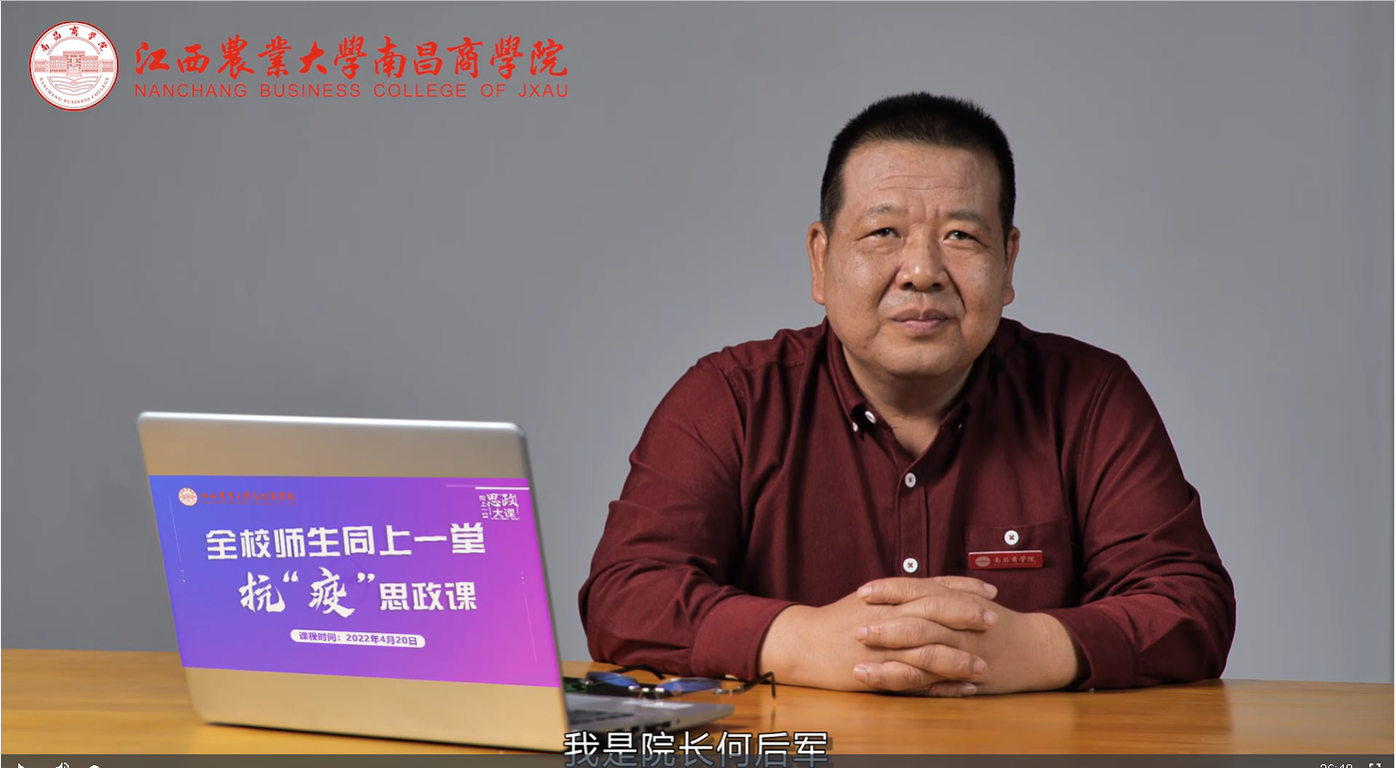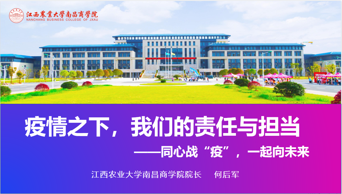 可喜的是,疫情下的南昌商学院仍然平安和谐,“疫情很艰难,但是我们并没有退缩,正因为有我们在坚持、在坚守,这一路走来,同学们、老师们、各岗位人员的付出才造就了和谐平安的校园。”何后军在授课中一一列举了学院师生同心抗“疫”的感人故事,表达了学院对全体师生的感谢,点赞表扬了战“疫”中可爱而又温暖的农商人。