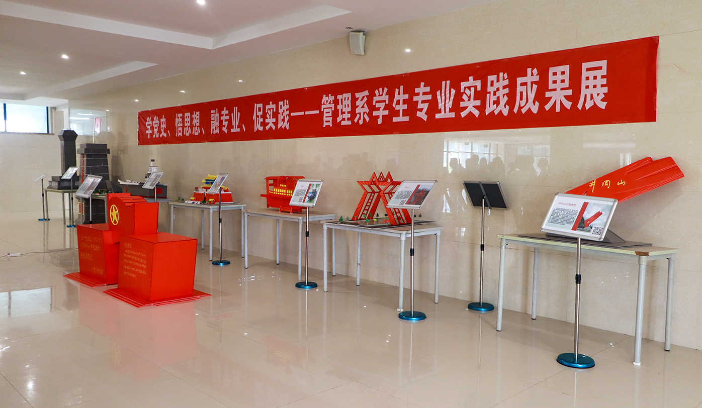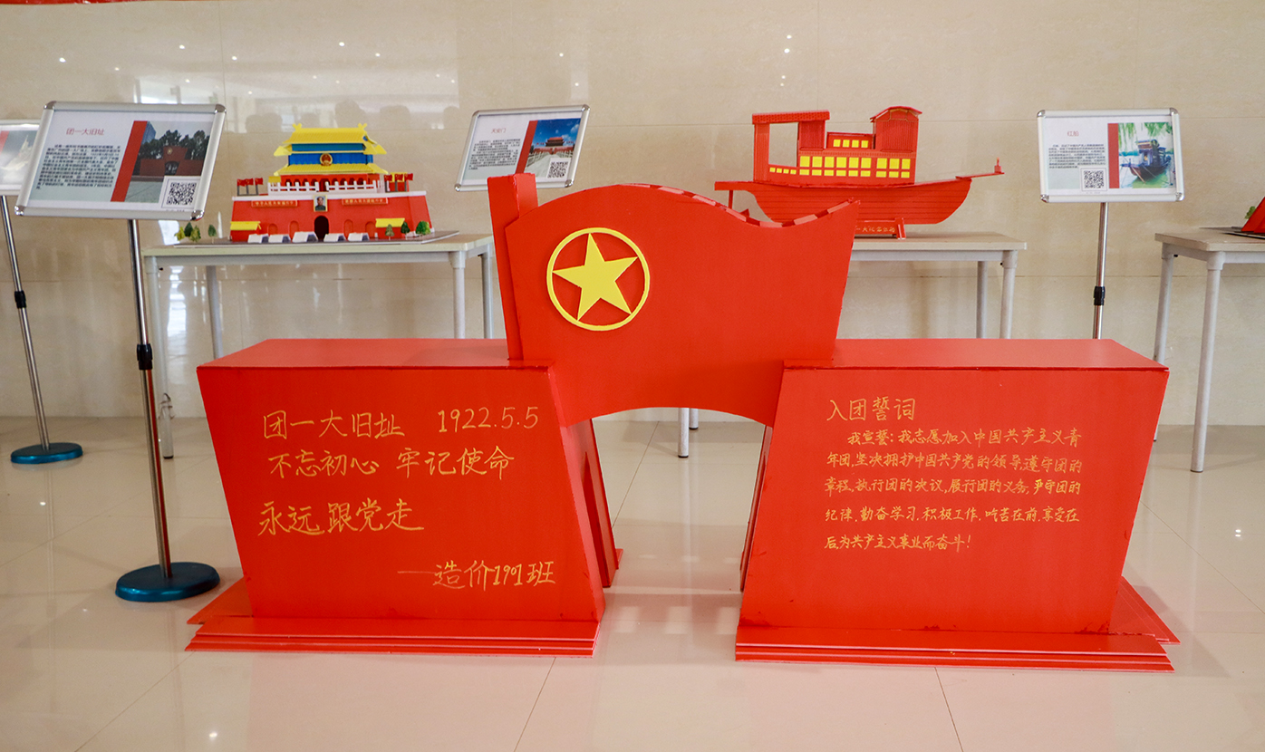 展览在旅游管理专业同学的专业展示中拉开序幕,成果展围绕建党百年、建团百年历史进行创作,同学们利用KT板制作模型,集中制作了井冈山红旗雕塑、团一大旧址、人民英雄纪念碑、山东舰等造型,从历史遗址、军事建设等方面展现了中国共产党百年以来不断奋斗进取的伟大成就。