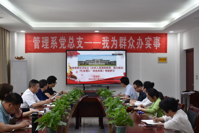 5月25日,按照教育思想大讨论工作实施方案的要求,管理系于明辨楼KN301召开第十五次专题学习会,主题为“办好人民满意的教育,着力推动“三全育人”综合改革”。孙小飞主持会议,全体教工通过线上、线下方式参加。