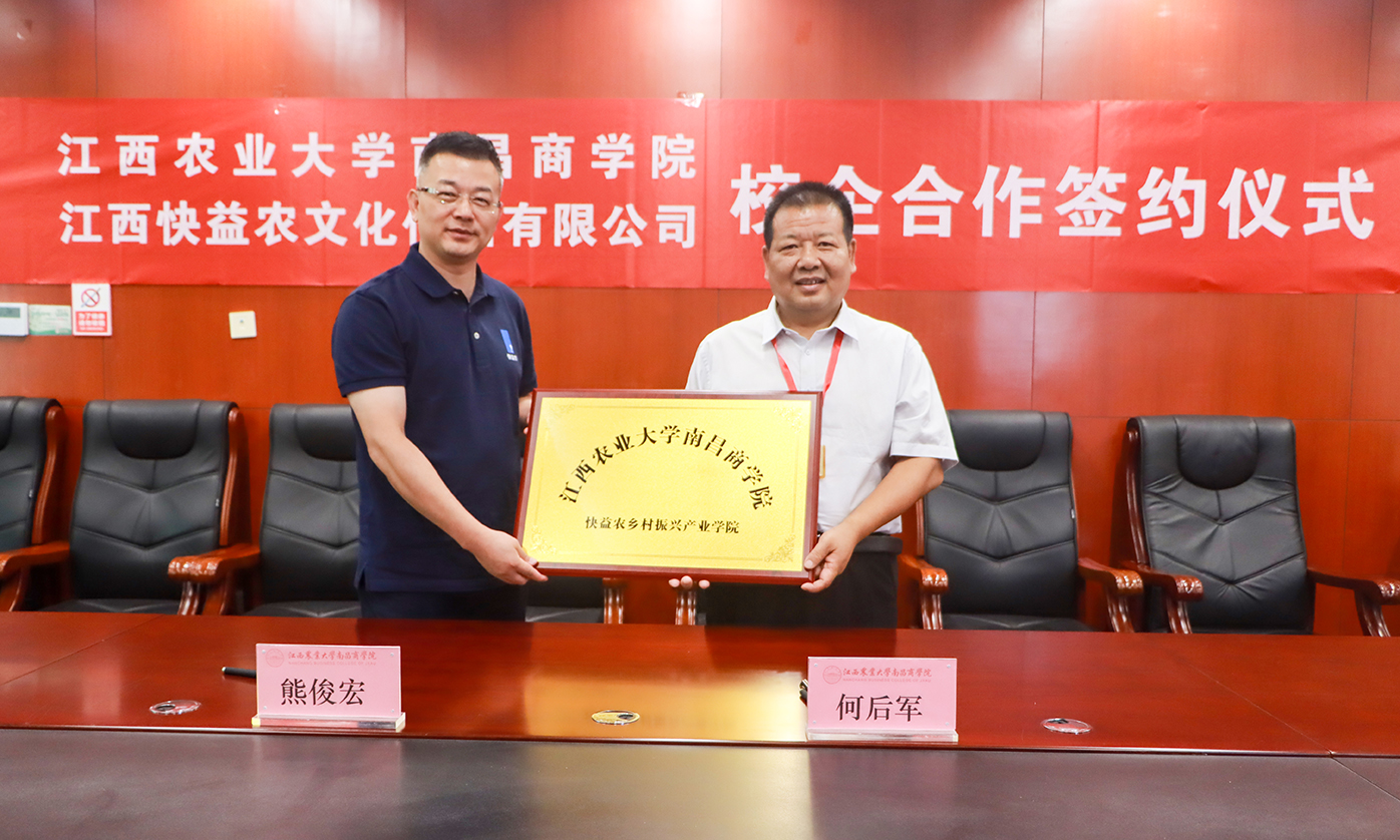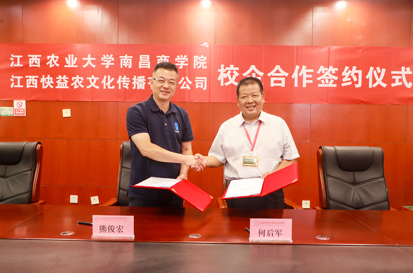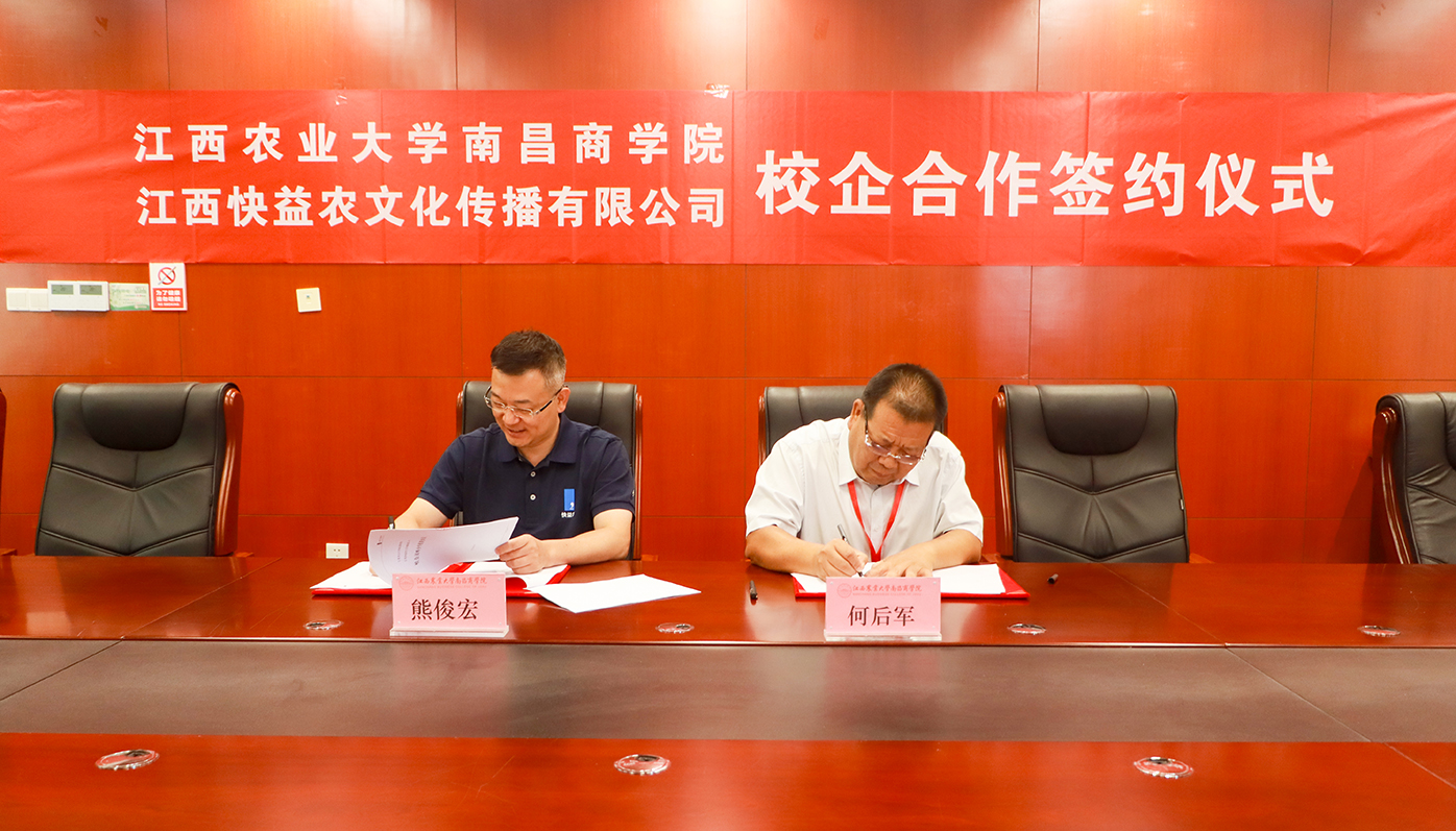 9月6日上午,学院与江西快益农文化传播有限公司在明道楼331会议室成功举行校企合作签约仪式。院长何后军与江西快益农文化传播有限公司董事长熊俊宏共同签订校企合作协议。