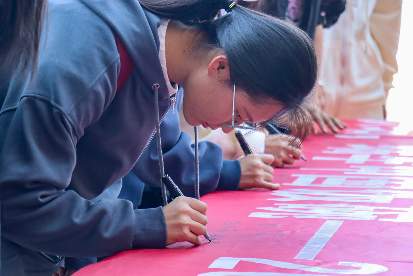 到场领导、老师积极响应活动号召,率先在横幅上提笔留名,并同现场同学亲切交流,倡导同学们爱粮节粮,坚决践行“光盘行动”,不铺张浪费,在全院形成保障粮食安全、爱粮节粮的浓厚氛围。现场师生纷纷签名,现场气氛热烈,横幅迅速被师生们的名字填满。活动最后,全体人员合影留念,留下对粮食安全的郑重承诺。