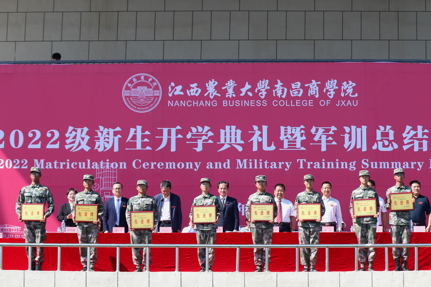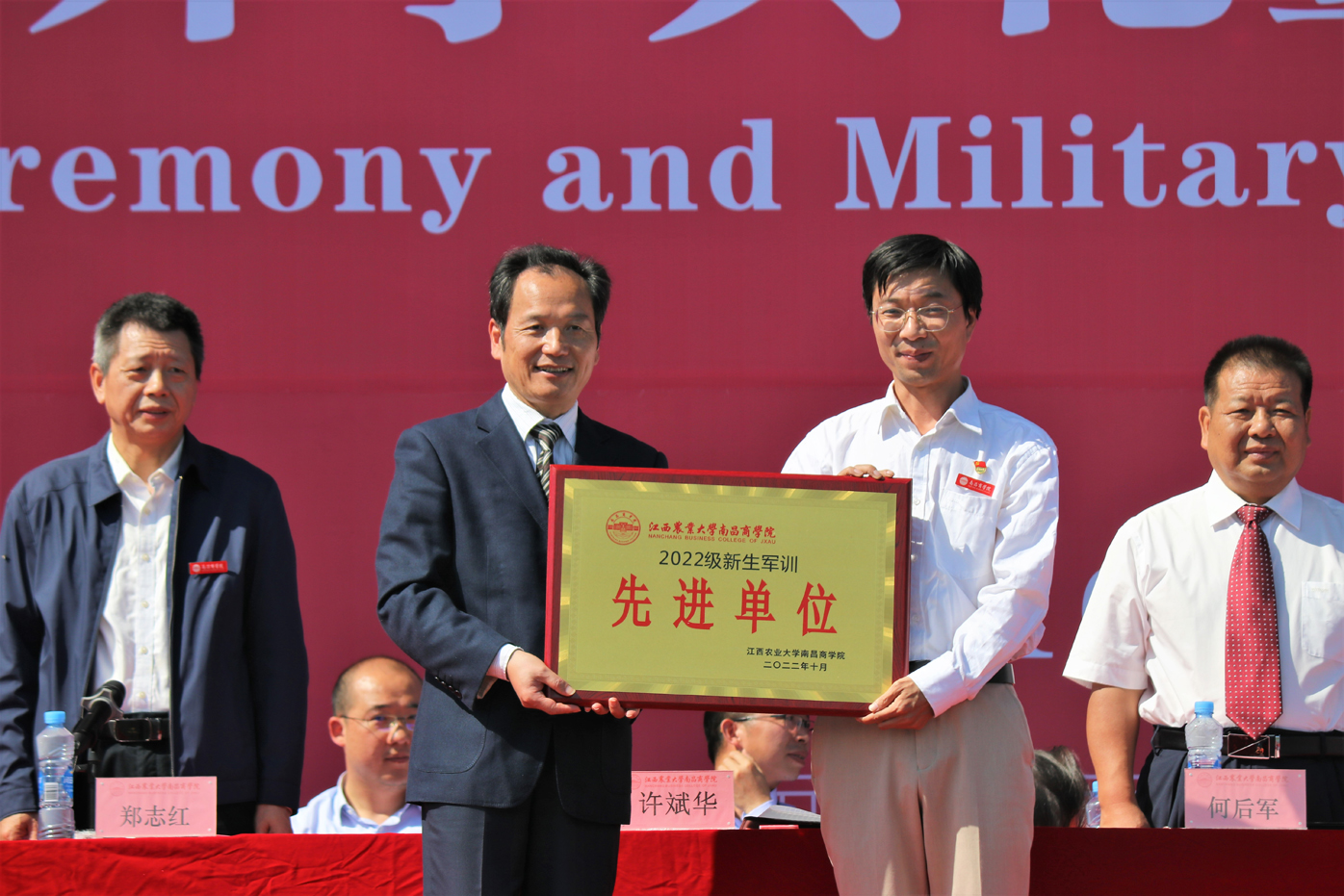 副院长谭飞宣读了《关于表彰2022级新生军训先进集体、优秀个人的决定》。许斌华副校长和院领导为军训期间表现优秀的集体和先进个人颁发荣誉证书并合影留念。
