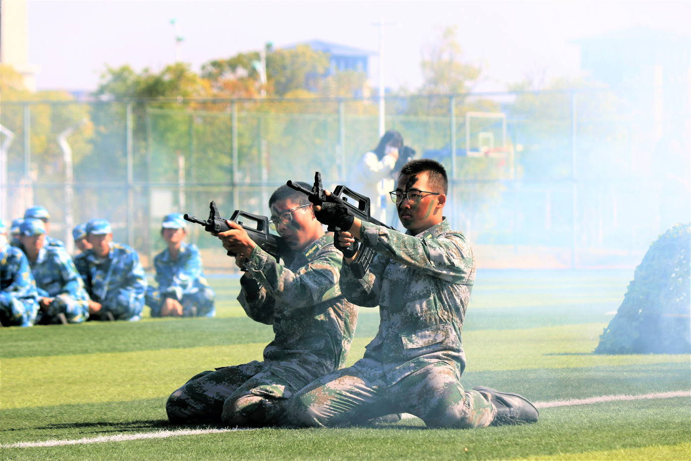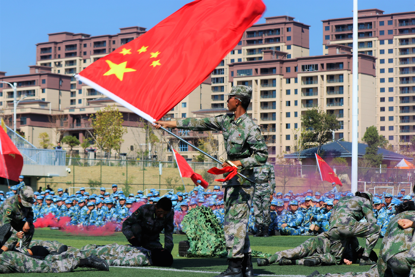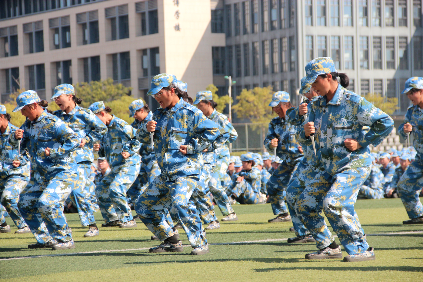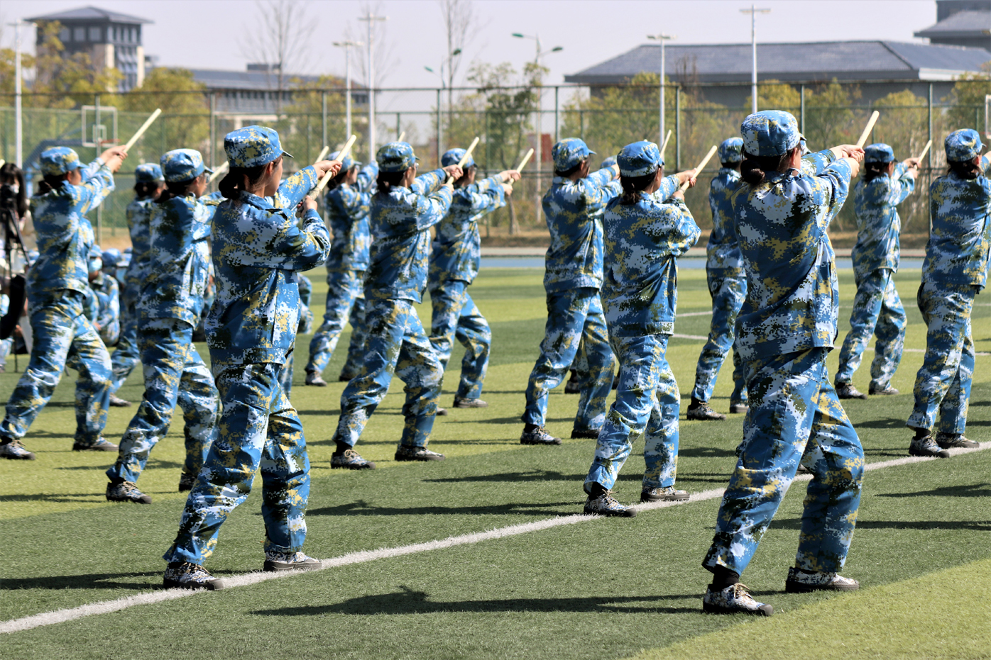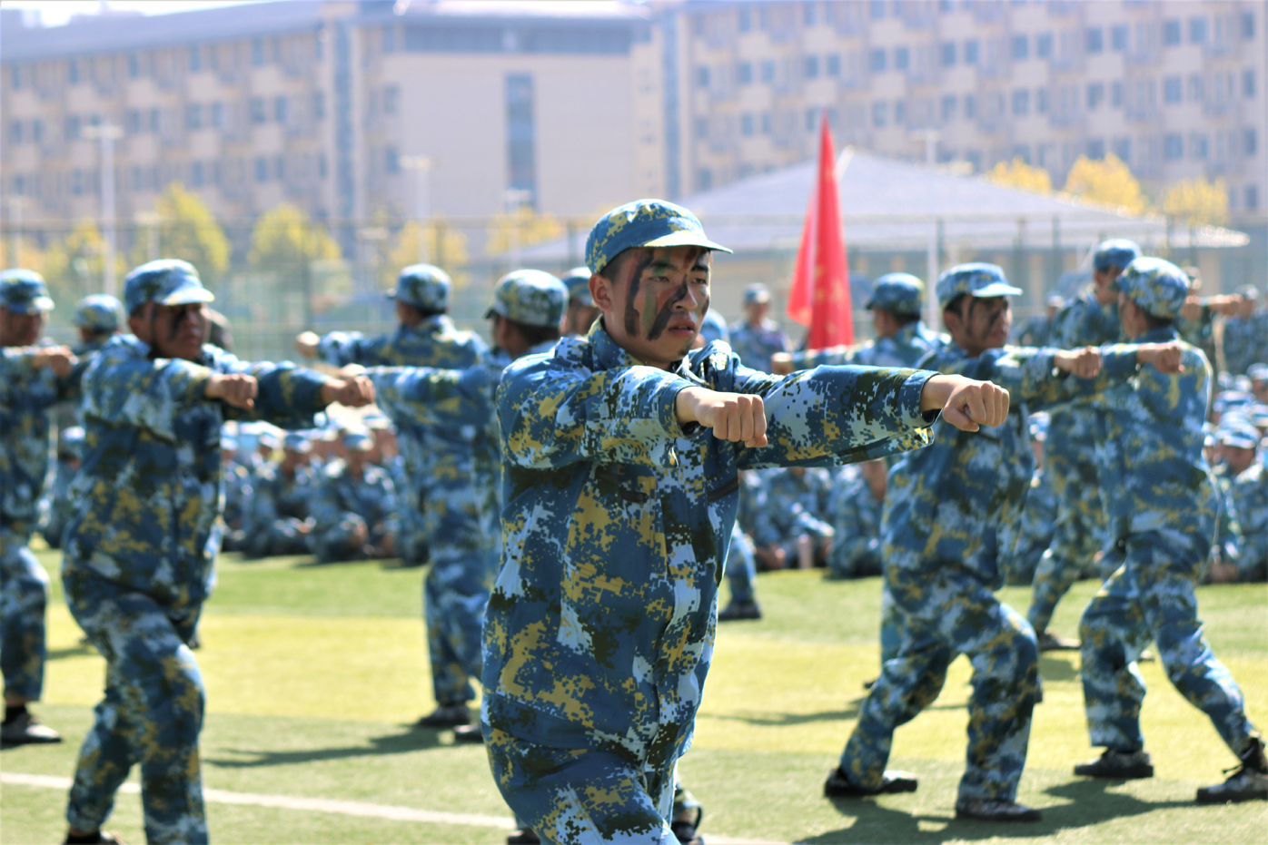 在军训成果汇报环节,学员们脚步铿锵,以饱满的精神状态和昂扬的斗志圆满完成了匕首术、擒敌拳、短棍术、旗语操、战术展示等汇报项目。气势磅礴的方阵、整齐划一的动作、振奋人心的口号,学员们以饱满的热情赢得了现场观众的阵阵掌声,充分展示了此次军训训练成果,充分展示了农商学子勇立时代潮头,勇担时代使命的精神风貌。