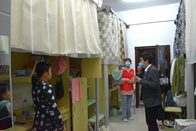 宿舍是同学们学习、休息和娱乐的主要场所,同学们的很多时间都在宿舍中度过,所以加强宿舍疫情防控宣传意义重大。防疫宣传岗的党员们进入学生宿舍,向同学们宣传防疫知识,叮嘱同学们每天按时在学工打卡,有感冒发烧的同学一定要及时上报,同时耐心倾听同学们的诉求,结合自身实际给同学们排忧解难,充分发挥了学生党员的先锋模范作用。在走访过程中,对寝室中乱接电线、违规使用大功率电器等行为进行排查的同时,也向同学们进行了安全知识宣讲。系主任孙小飞从寝室用电安全谈起,延伸到消防安全以及财产安全,为同学们上了一堂较为系统的安全知识课。普及安全知识的同时,也对学生们进行了人文关怀,耐心询问期末备考情况,叮嘱同学们冬季降温记得添加衣物。