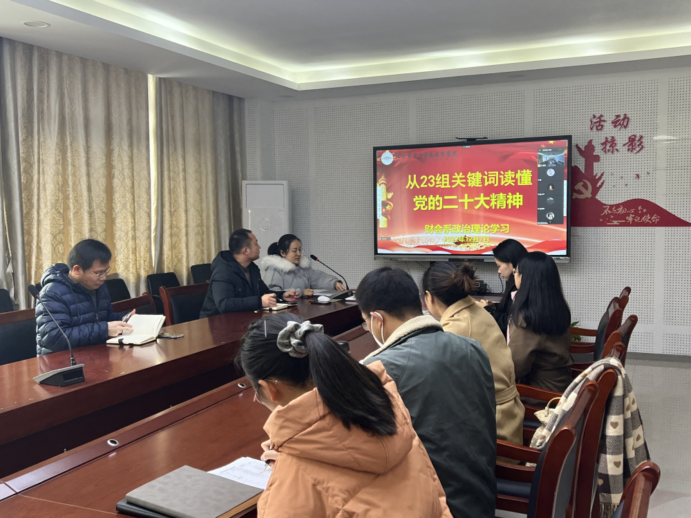 为进一步学习宣传贯彻党的二十大精神,12月7日下午,财会系于明辨楼KN401召开党的二十大精神专题学习会。系主任谌种华、系党总支书记李锐及全体教师通过线上线下的方式参加会议。