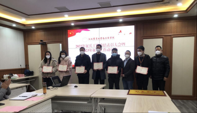 邓玲宣读了《关于表彰2022年大学生征兵工作先进单位、先进个人的决定》,授予外语系“征兵工作先进单位”荣誉称号、授予经济系辅导员黄小岭、外语系吴琼等8位老师“征兵工作先进个人”荣誉称号。杨欢为受表彰的单位和个人颁发奖牌和荣誉证书。