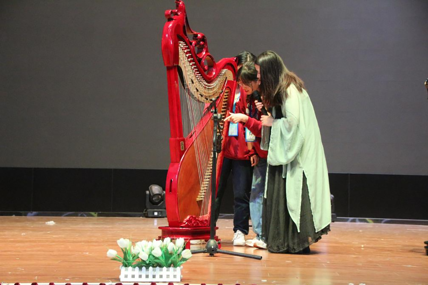 讲座现场,江西中弦箜篌乐团的两位老师演奏了箜篌经典曲目《不染》、《大鱼》,乐音悠扬婉转,乐曲的音律随演奏者手指轻挑而动,箜篌古曲环绕在观众耳边,其音域宽广、音色柔美清澈,带领观众穿越古今,流连在美妙的乐音之间。随后,张美慧邀请了三位同学上台亲身体验箜篌的独特魅力,并对同学们提出三点希望:一要做传承的践行者;二要做文化的推动者;三要做时代的捍卫者。