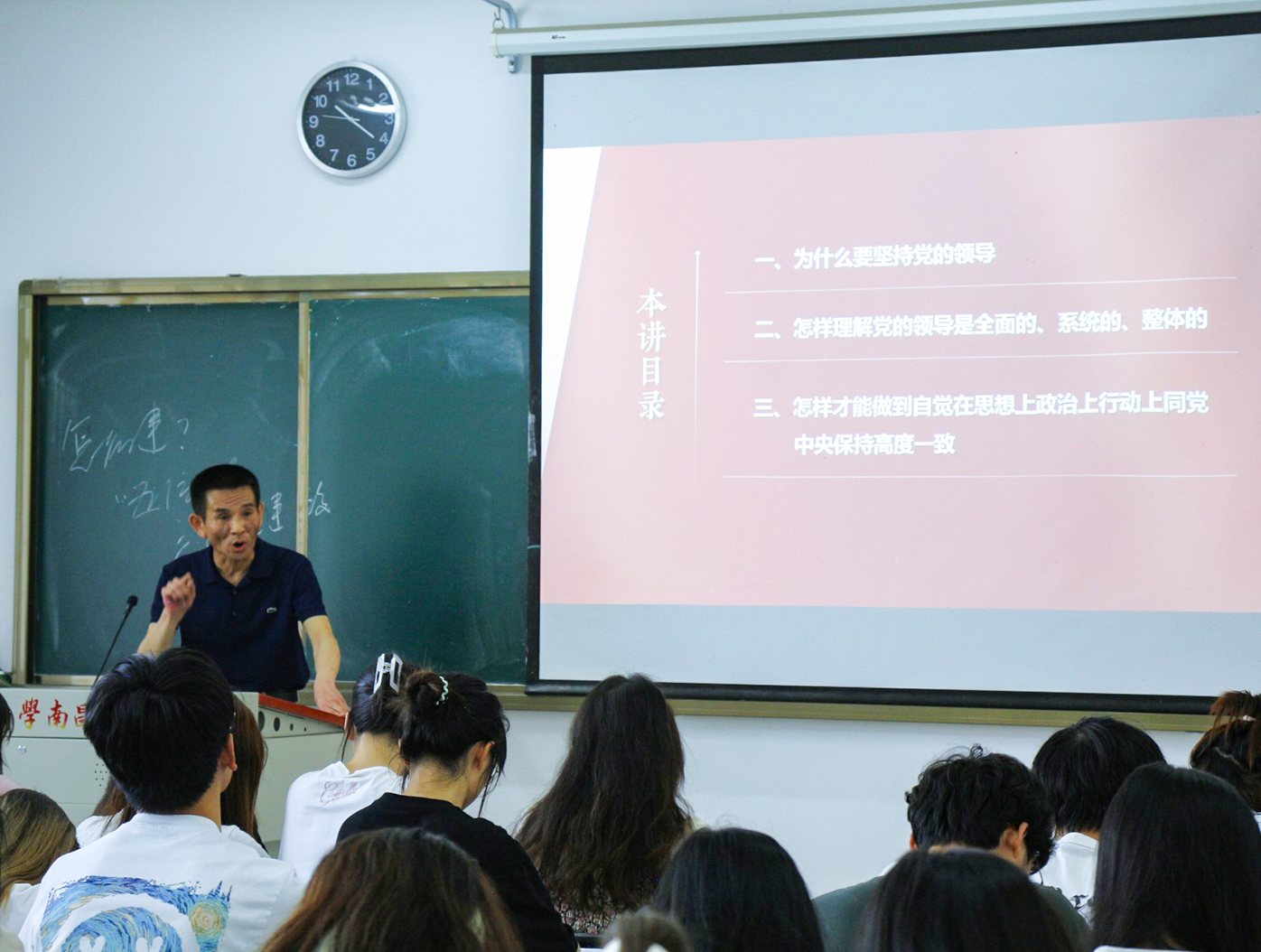 课上,院领导与学生们一起认真聆听马克思主义学院邱良老师讲授的《习近平新时代中国特色社会主义思想概论》课程,课程围绕“党的全面领导”这一主题,从“为什么要坚持党的领导”、“怎样理解党的领导是全面的、系统的、整体的”、“怎样才能做到自觉在思想上政治上行动上同党中央保持高度一致”三个方面来讲述党的领导的重要性。