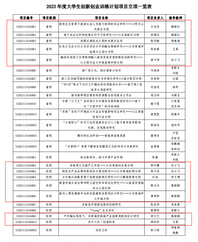 根据《江西省高等学校大学生创新创业训练计划实施管理办法(试行)》、《省教育厅关于报送2023年大学生创新创业训练计划立项项目的通知》等文件要求,经评审通过,2023年全院大学生创新创业训练计划项目立项的项目总共28个,管理系12个;其中省级立项全院14个,管理系5个。(文、图/管理系,审核/杨谨鸿)