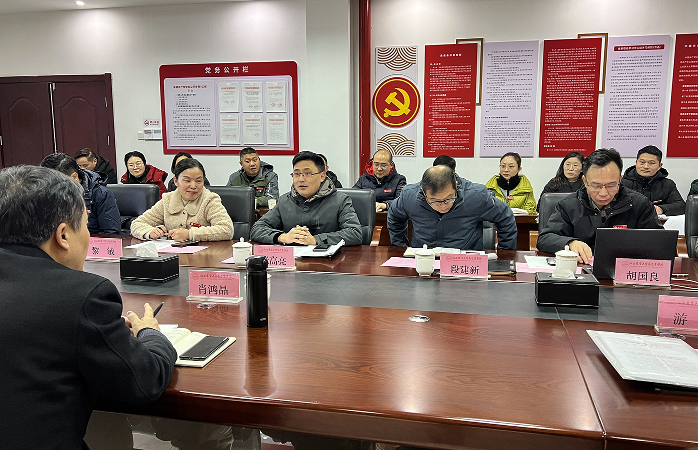 2月6日,由江西经济管理干部学院党委委员、副校长肖鸿晶为组长的省教育厅专家组一行3人莅临学院开展2023年度独立学院综合考核现场核查工作。学院在明道楼B221召开座谈会,江西农业大学党委委员、副校长张高亮,共青城中航文化投资有限公司总经理、学院董事段建新,院党委书记黎敏,院长胡国良及全体院领导,相关部门负责人参加会议。