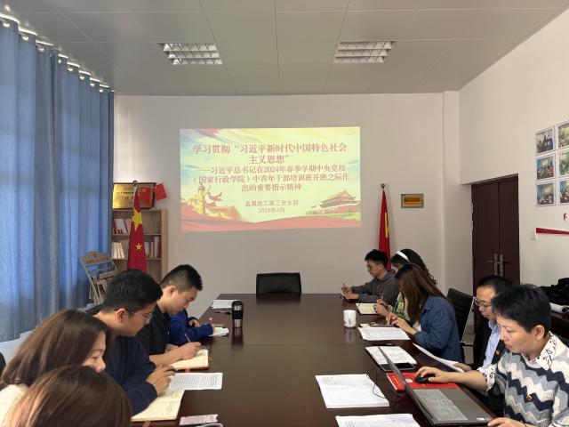 4月11日上午,院直属教工第三党支部在笃行楼320会议室召开党支部集体学习会,学习主要内容有习近平总书记在2024年春季学期中央党校(国家行政学院)中青年干部培训班开班之际的重要指示精神、保密知识专题等。支部全体党员参加学习。