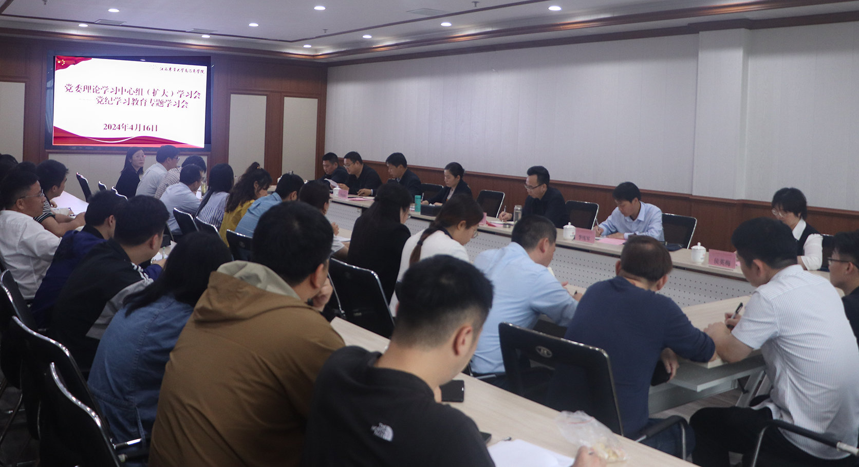 4月16日下午,学院党委理论学习中心组在明道楼B203视频会议室召开第5次(扩大)学习会,全体院领导,职能部门主要负责人、各系党总支书记、各党支部书记参加会议。