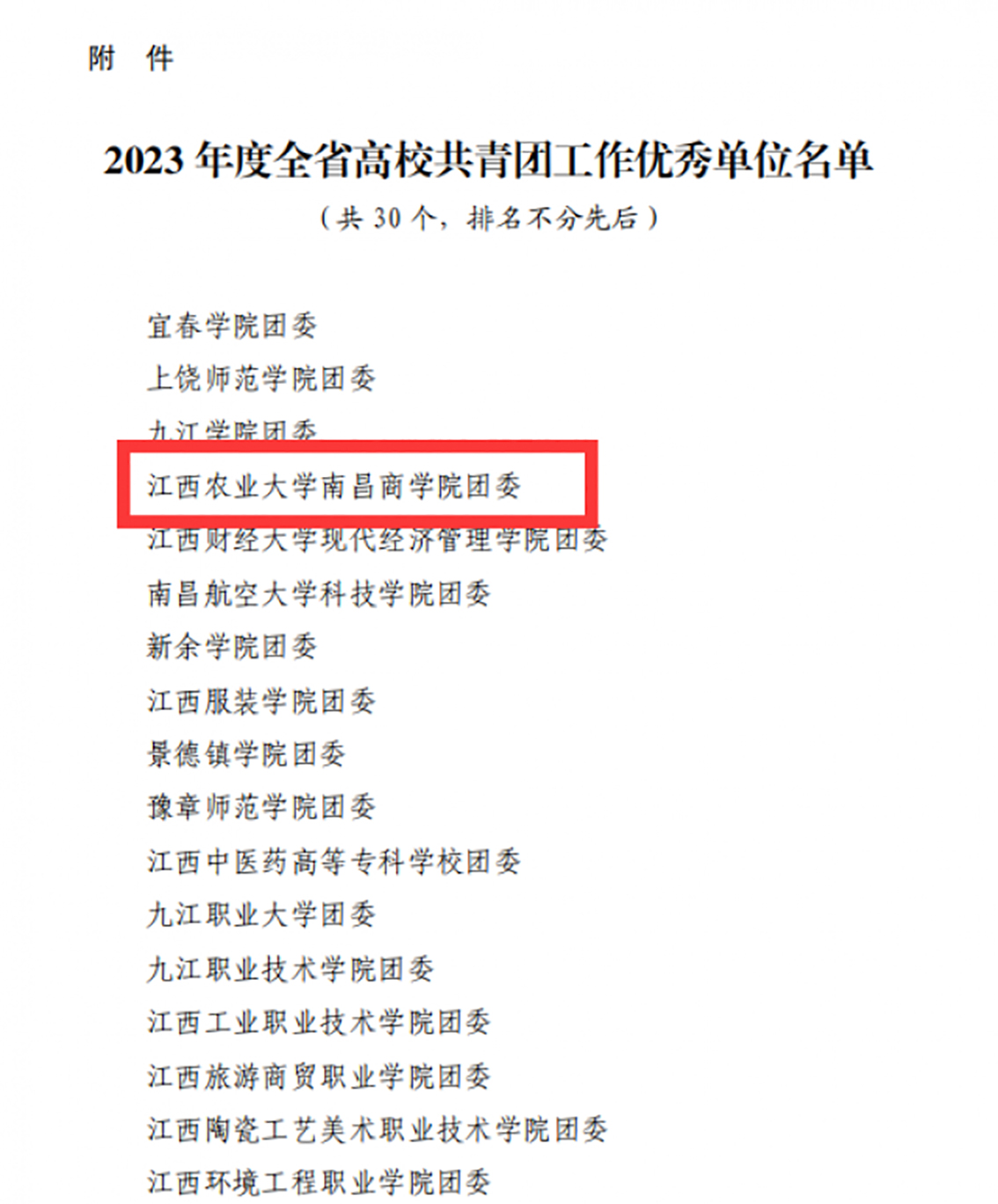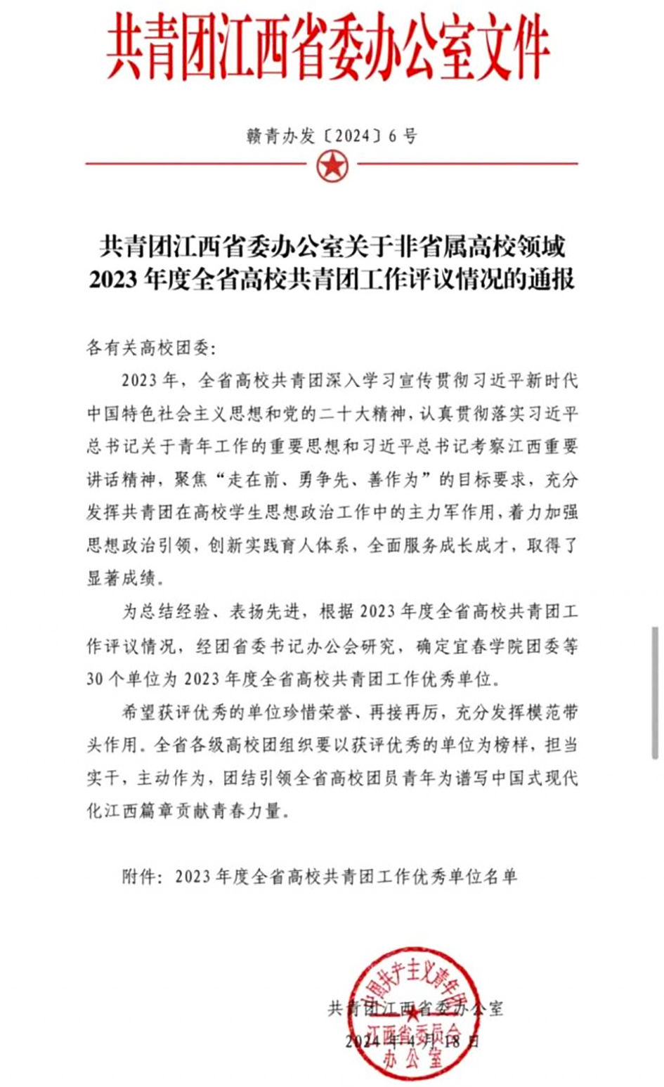 4月18日,共青团江西省委办公室印发《共青团江西省委办公室关于非省属高校领域2023年度全省高校共青团工作评议情况的通报》(赣青办发〔2024〕6号),学院团委荣获“全省高校共青团工作优秀单位”称号,这是学院连续第四年获此荣誉。