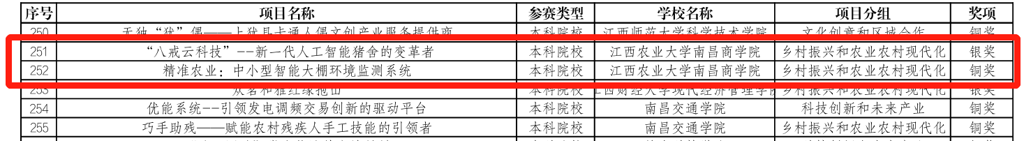 在学院党委的高度重视下,院党委书记黎敏、院长胡国良、党委副书记李海峰亲自指导调度赛事,院团委积极做好全程服务,由黄艺、胡国良、李练军、于盈老师指导,计算机系尹拓、高伟杰、卢凡蕊组成的学生团队,师生共创的《“八戒云科技”——新一代人工智能猪舍变革者》项目荣获第十四届“挑战杯”江西省大学生创业计划竞赛银奖。这是学院在江西省挑战杯中的新突破,首次荣获省级银奖!同时,由邓玲、吴俊芳、宫济鸿、郭侠老师指导,计算机系学生孙欣雨、刘英豪、柯芦倩、张斌彬、康木生参赛的团队《精准农业:中小型智能大棚环境检测系统》项目荣获铜奖。