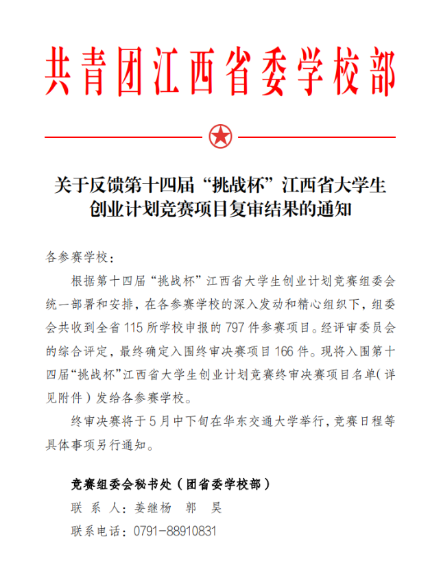 近日,由团省委、省教育厅、省人社厅、省科协、省学联主办的第十四届“挑战杯”江西省大学生创业计划竞赛终审决赛在华东交通大学举行,学院共有八个项目参加省赛。