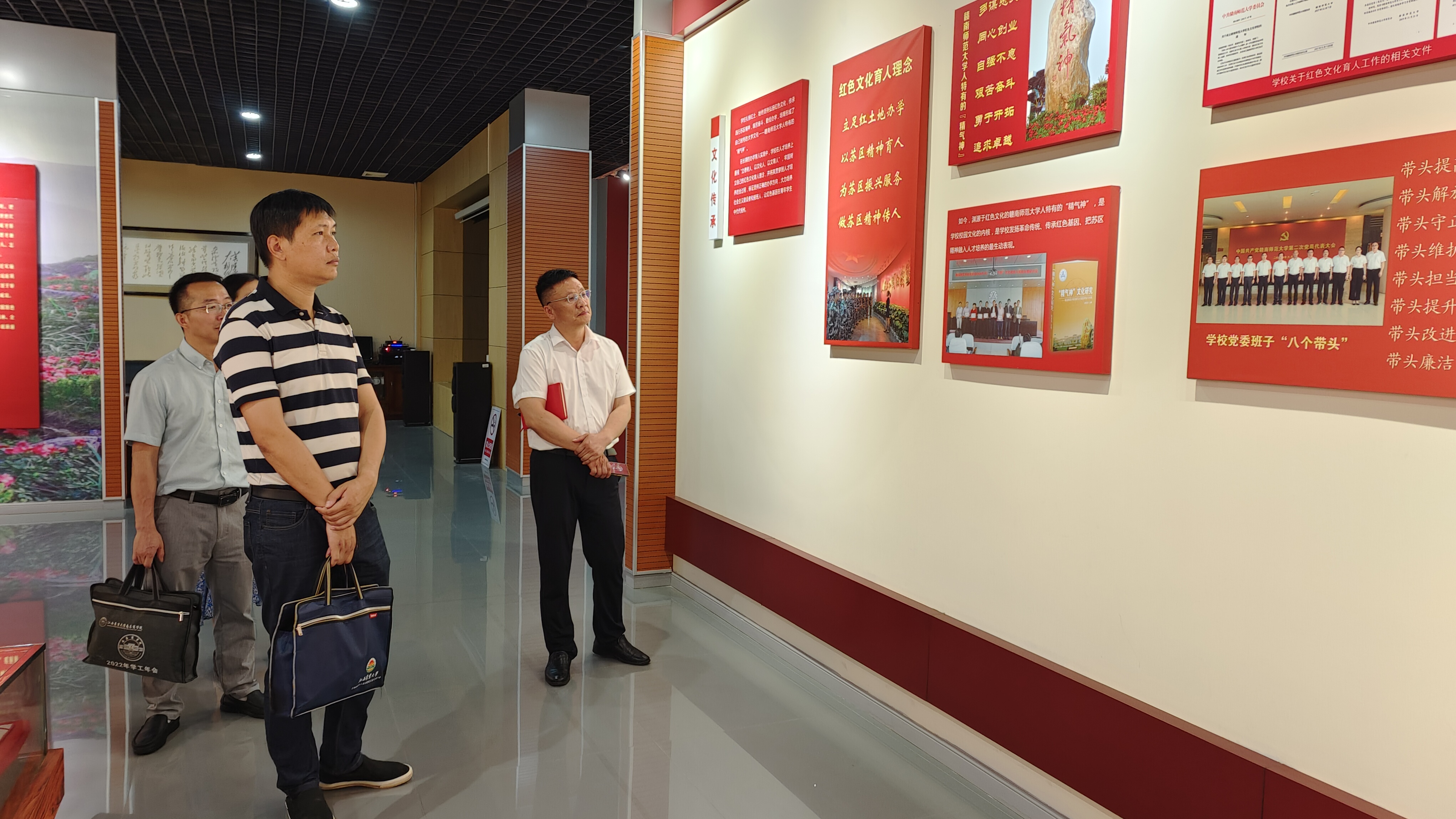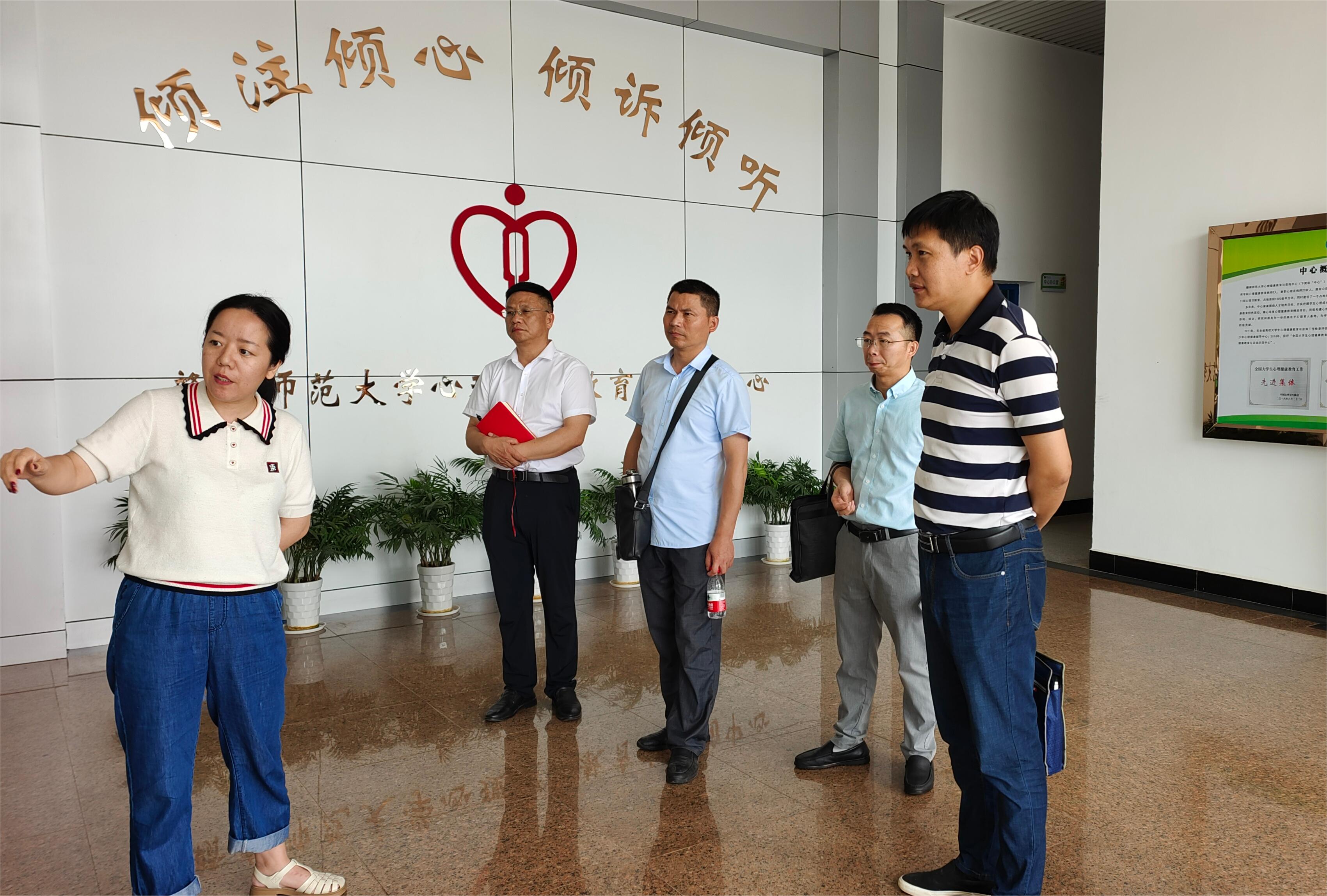 赣南师范大学组织部副部长肖平接待了李海峰一行。一行人来到赣南师范大学“一站式”学生社区服务中心大厅,了解服务中心的主要工作开展情况,工作流程和管理模式以及党建工作进学生社区、辅导员名师工作室工作开展情况。在赣南师范大学红色文化育人成果展馆,李海峰一行认真观看展览,了解学校红色文化育人特色工作的丰富成果。在赣南师范大学心理健康教育与咨询中心,李海峰一行参观中心的基础设施并了解心理健康教育工作开展情况。在座谈会上,肖平介绍了赣南师范大学党建工作引领红色文化育人特色工作开展情况,相关负责人介绍了“苏区红”数字资源库建设和使用情况以及辅导员队伍建设工作。双方就红色文化资源的保护、开发,辅导员队伍建设,心理健康教育工作,“一站式”学生社区建设工作进行了深入交流。