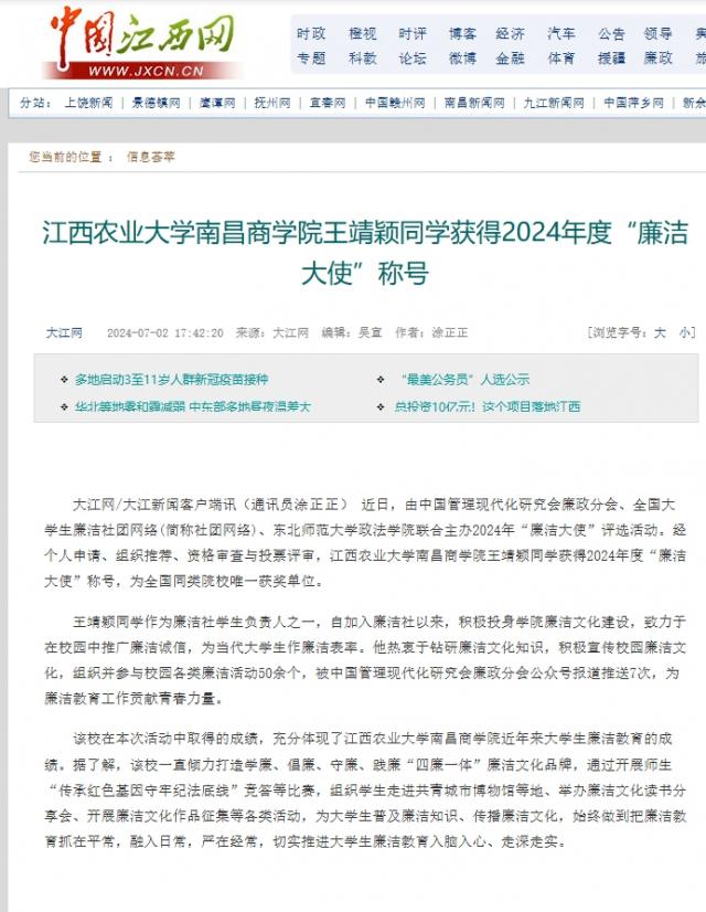 【中国江西网】江西农业大学南昌商学院王靖颖同学获得2024年度“廉洁大使”称号