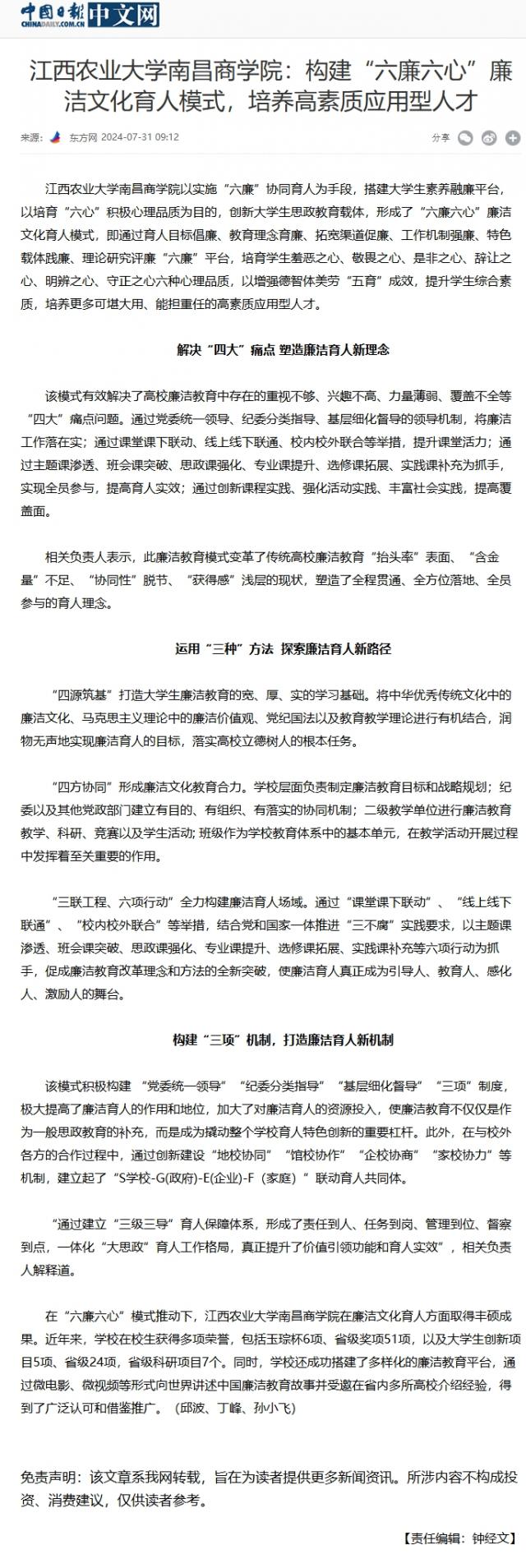 【中国日报】江西农业大学南昌商学院:构建“六廉六心”廉洁文化育人模式,培养高素质应用型人才