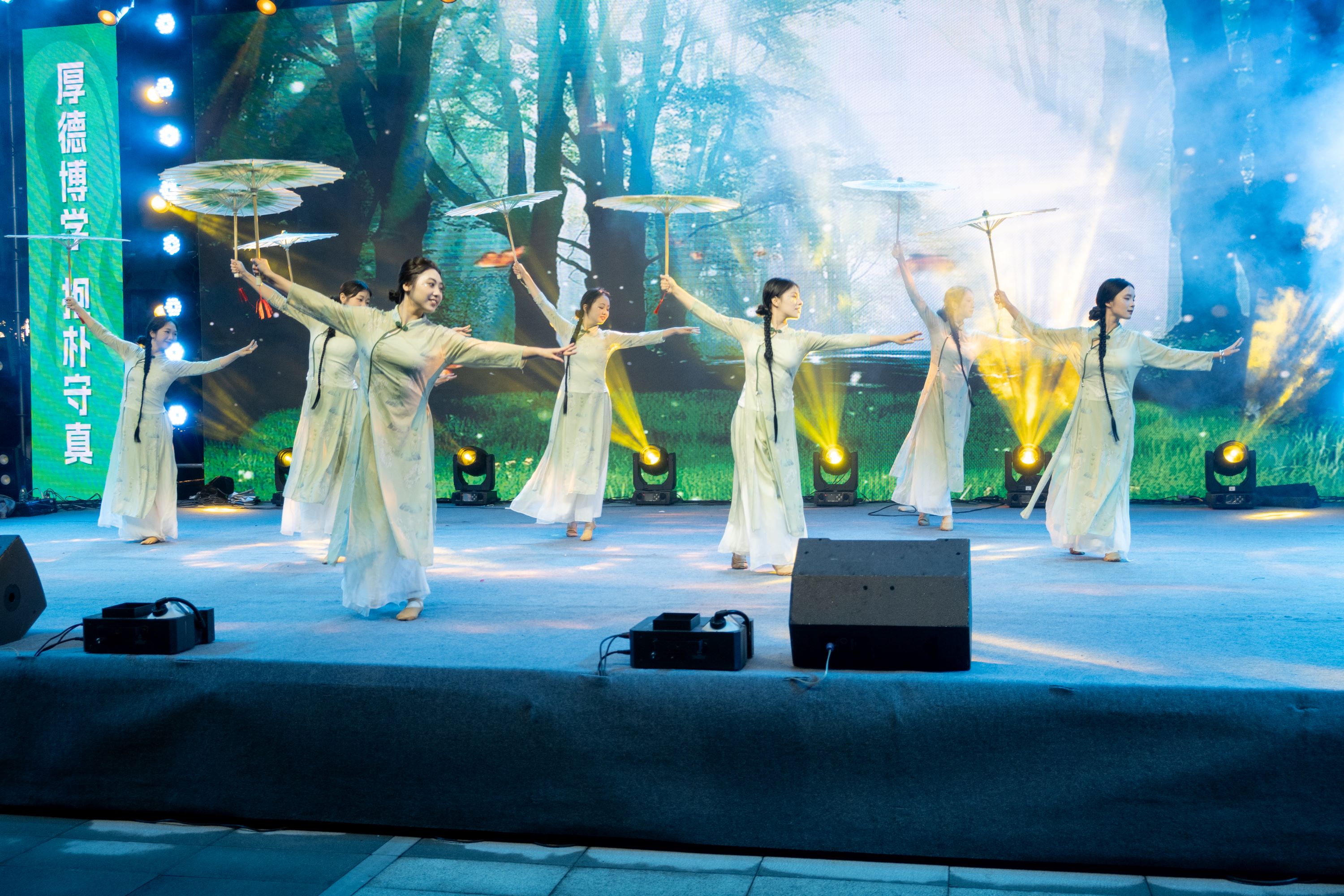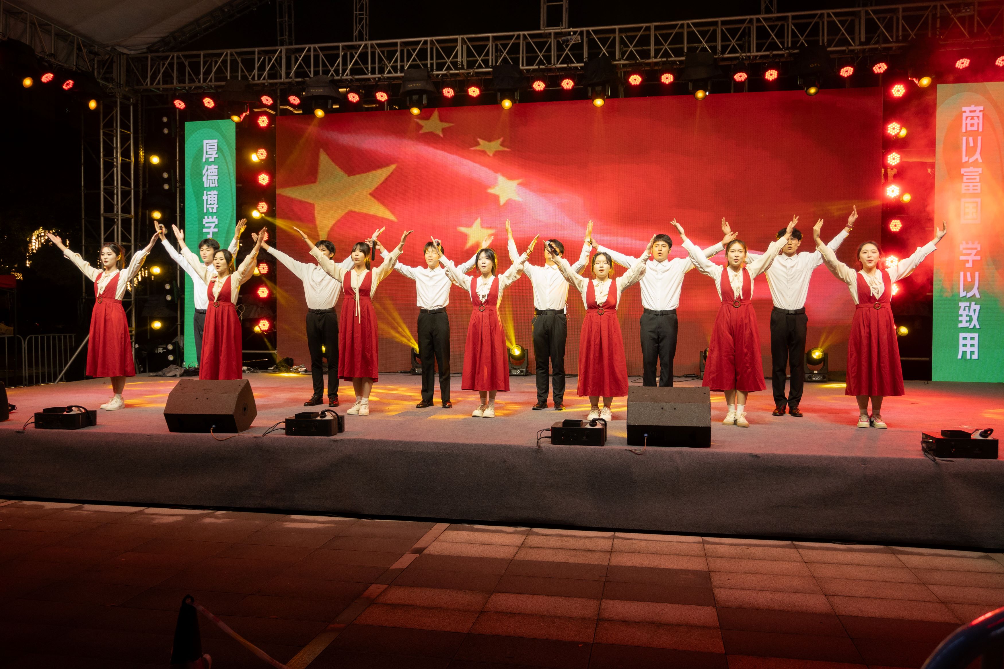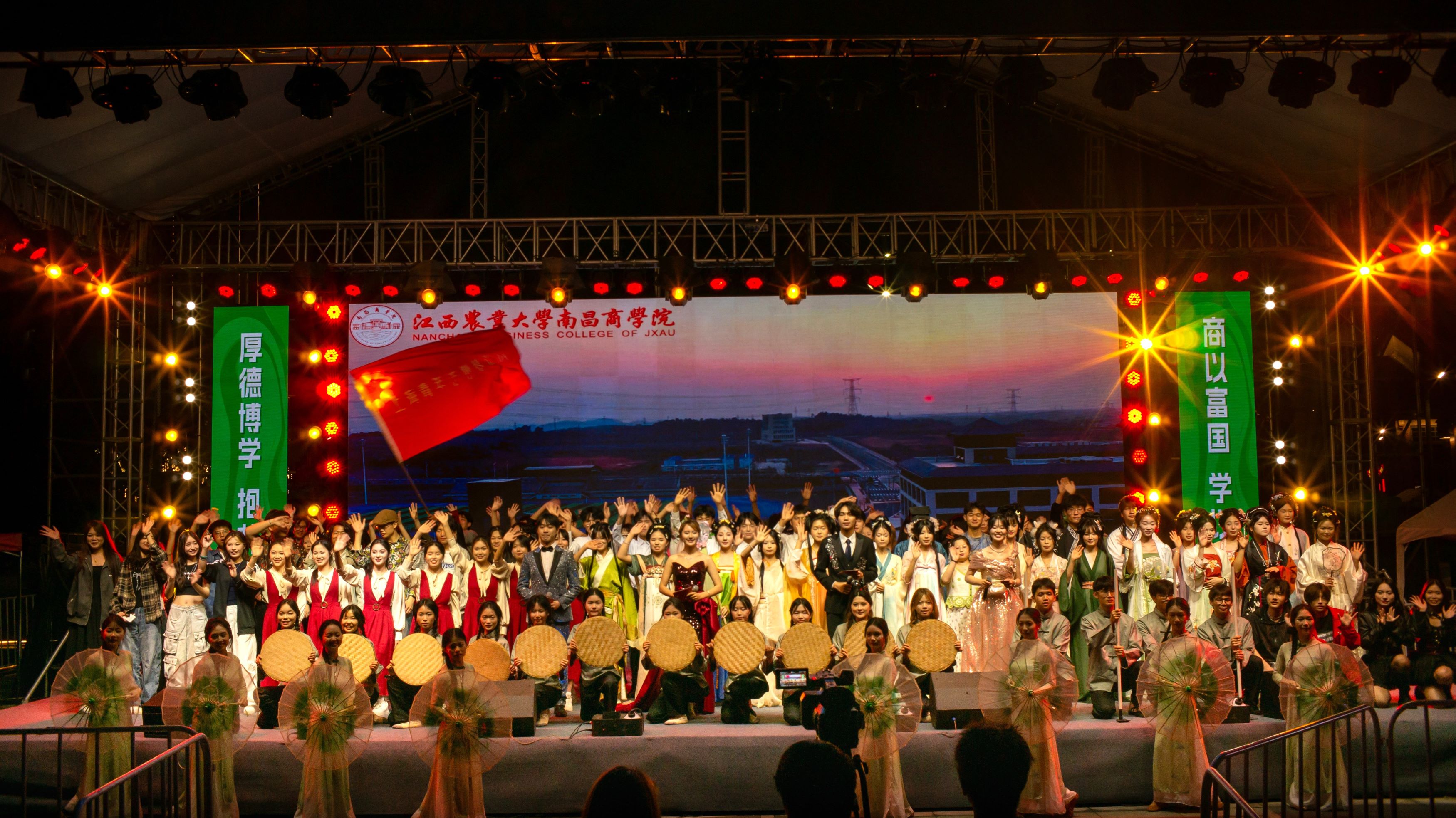 正式表演环节,正式FLOOD说唱社的特别版《我只在乎你》以独特的节奏与韵律瞬间点燃全场;商院主持队的朗诵舞蹈《我爱你,中国》充分表达了农商学子们对祖国的无限热爱;院排舞队《梨花又开放》排舞表演及人文与艺术系《锦绣汉风,裳影逸行》汉服秀将中华优秀传统文化的魅力体现得淋漓尽致;话剧团课《共青共青》垦荒篇之《垦荒春潮,荒山野岭换新颜》在商之韵舞蹈队的演绎下,生动再现了那段艰苦奋斗的日子。活动尾声,浔声配音社的配音表演《声声诗意》,计算机系、外语系舞蹈队展示舞蹈《旷野》,助力此次表演圆满落幕。