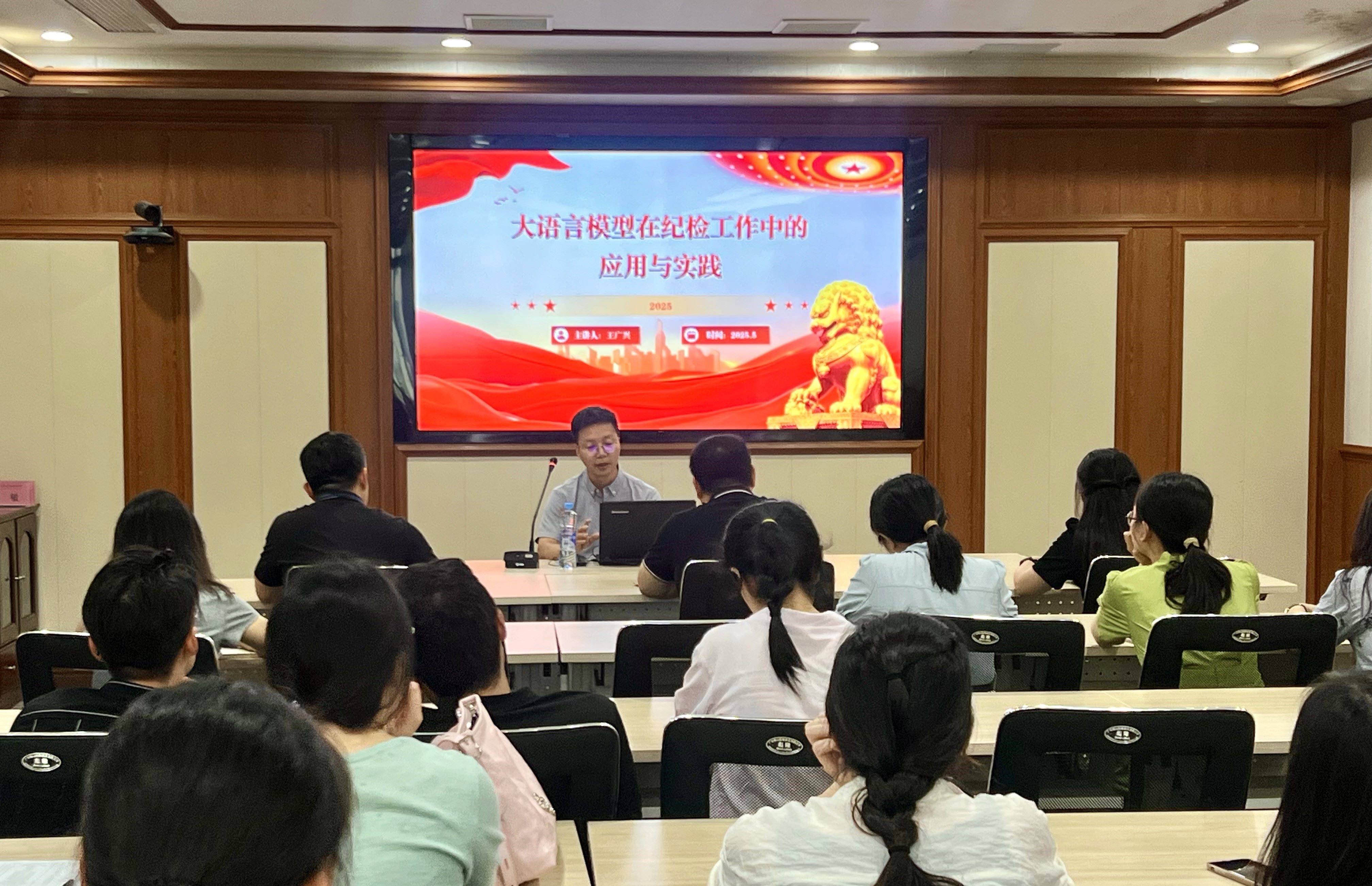 5月22日,学院纪委在明道楼203视频会议室举办2025年第二期专兼职纪检干部培训班,九江学院王广兴博士应邀作《大语言模型在纪检监察工作中的实践探索》专题讲座,院纪委书记邱波及全院专兼职纪检干部参加听讲。