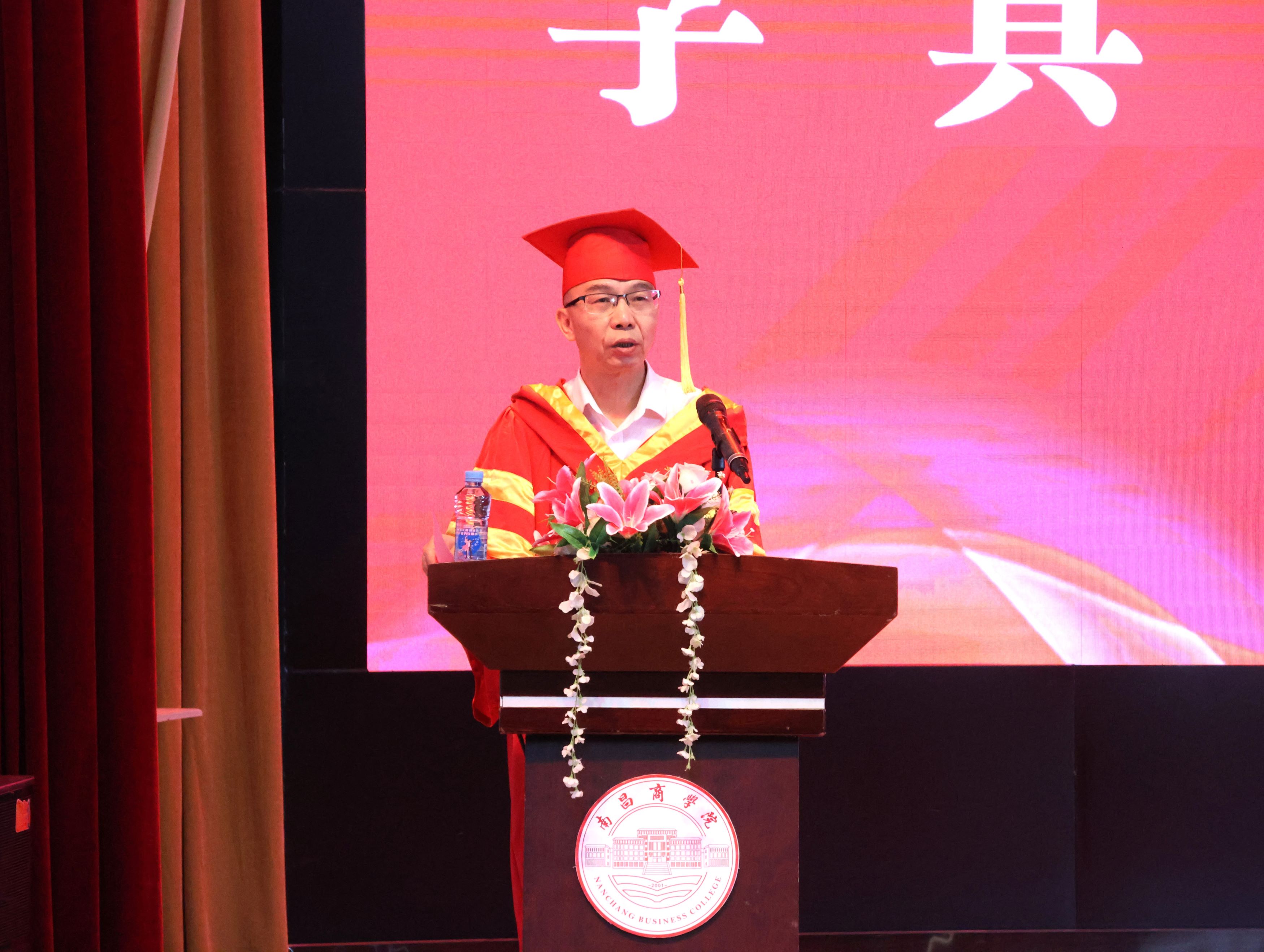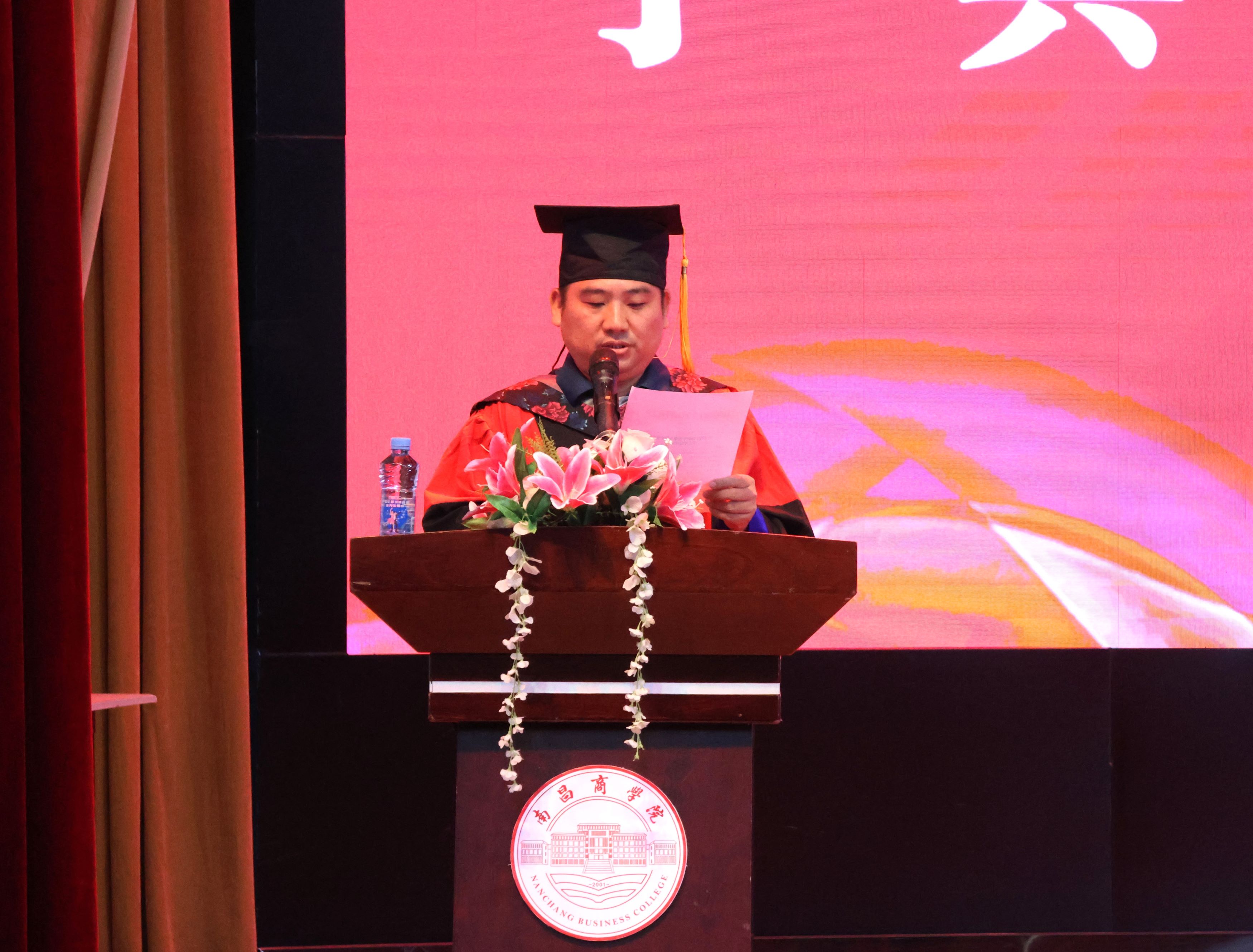 会议伊始,全体起立奏唱国歌,行注目礼。院长胡国良代表学院向全体毕业生们表示热烈的祝贺,并围绕“以青春之名踏浪长歌”讲述“农商人”的青春故事,对全体毕业生提出三点希望。一是要以“千磨万击还坚劲”的自信,做“追光而行”的坚守者;二是要以“风物长宜放眼量”的智慧,做“破局求变”的开拓者;三是要以“问渠那得清如许”的渴求,做“知行合一”的修行者。胡国良期望全体毕业学子以自信为帆、以智慧为桨、以奋斗为锚,在时代浪潮中踏浪前行,在祖国需要的地方扎根、生长、绽放。
