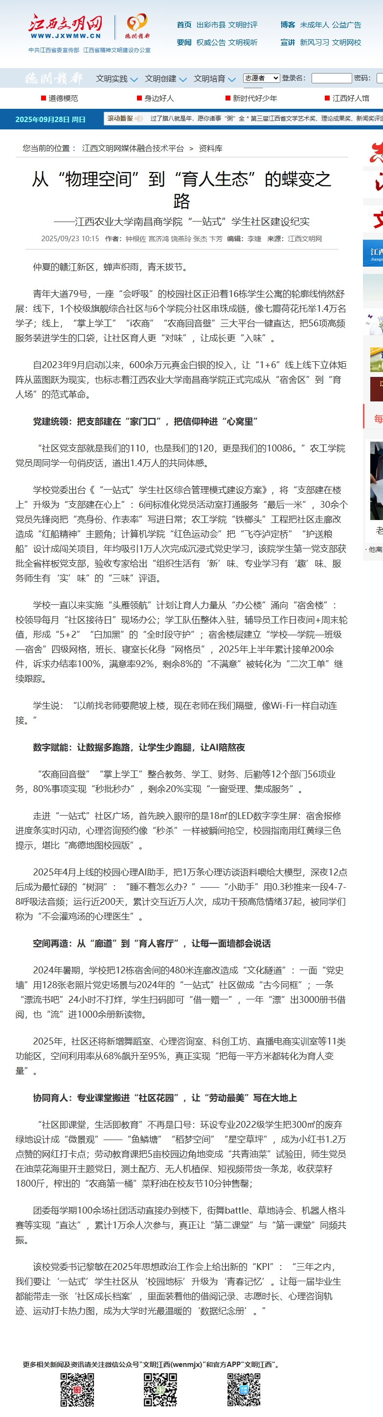 【江西文明网】从“物理空间”到“育人生态”的蝶变之路 ——江西农业大学南昌商学院“一站式”学生社区建设纪实
