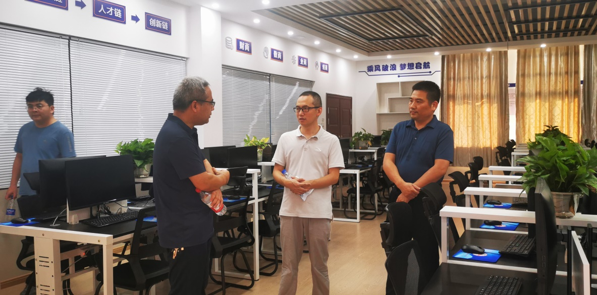 为深入推进共青城市现代产业学院建设工作,精准评估高校产业学院建设成效,9月28日下午,由共青城市工信局袁训平、邹红艳,教体局陈齐奇、校地办李波组成的现代产业学院实地核查项目团队一行,到我校实地调研现代产业学院建设情况。院副书记李海峰、副院长徐发亮,教务处、信息化处、产业学院及相关实验室负责人陪同。
