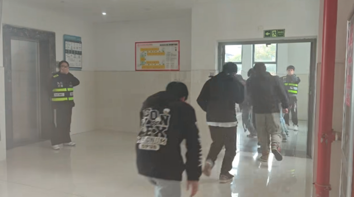 随后,演练模拟慎思楼发生火情,相关老师迅速拉响警报。在现场老师的有序引导下,同学们使用湿毛巾捂住口鼻迅速向楼下撤离,通过安全通道迅速而有序地撤出慎思楼到达指定安全位置。