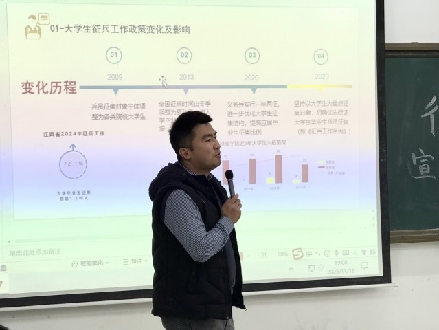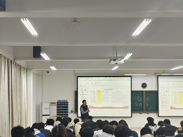 为积极响应国家征兵号召,助力更多优秀学子投身军旅,11月19日晚,语言与文法学院在厚德楼AW101教室举办征兵政策宣讲会,特邀人武部古宝荣老师为200余名学生开展应征入伍政策宣讲。