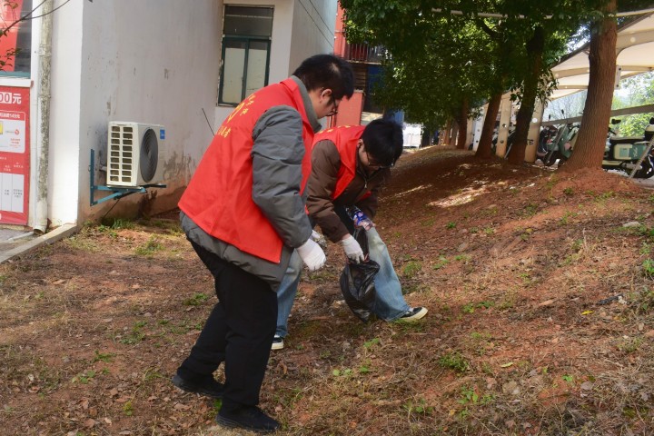 活动中,志愿者统一身着红色志愿马甲,携带清洁工具,以饱满的热情投入服务。他们对小区路面、草坪进行全方位清扫,重点清理白色塑料垃圾、枯木树枝等杂物;在绿化带区域,志愿者俯身深入灌木丛,细致捡拾隐藏其中的生活垃圾,确保卫生无死角。活动累计清理垃圾20余公斤,完成300米绿化带整治,开展互动式环保宣讲20余人次。