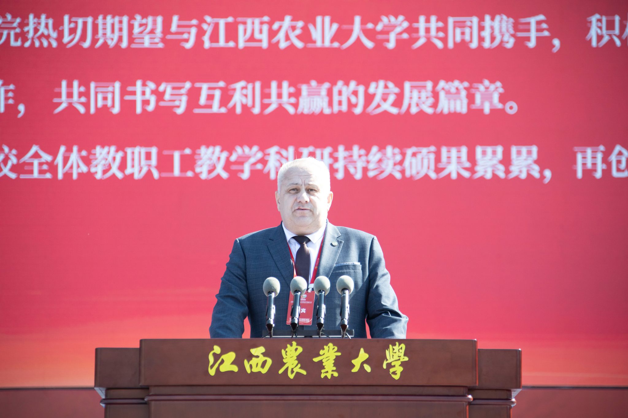 国外合作高校代表、白俄罗斯国立农业科学院副校长蒂贝茨·尤里·列昂尼多维奇在致辞中对江西农业大学120周年华诞致以诚挚祝贺,并表示江西农业大学历经百廿发展,始终坚守教育初心,培养的各个领域高素质专门人才成为推动行业发展和社会进步的中坚力量,科技创新优势突出,为农业科技进步作出重要贡献。热切期望两校共同携手,在教育合作、科技攻关、人文交流等领域加强合作,共同书写互利共赢的发展篇章。