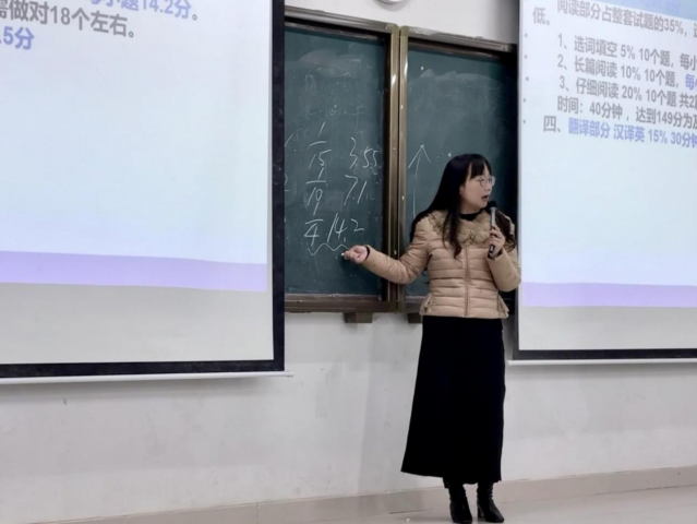 为充分发挥教师党员先锋模范作用,切实为学生解难题、办实事,助力新生高效备战全国大学英语四、六级考试,12月4日晚,语言与文法学院在厚德楼AW101教室举办英语四六级备考讲座。本次讲座特邀公共英语教研室教师杨珊主讲,吸引了全校大一、大二学生踊跃参与。