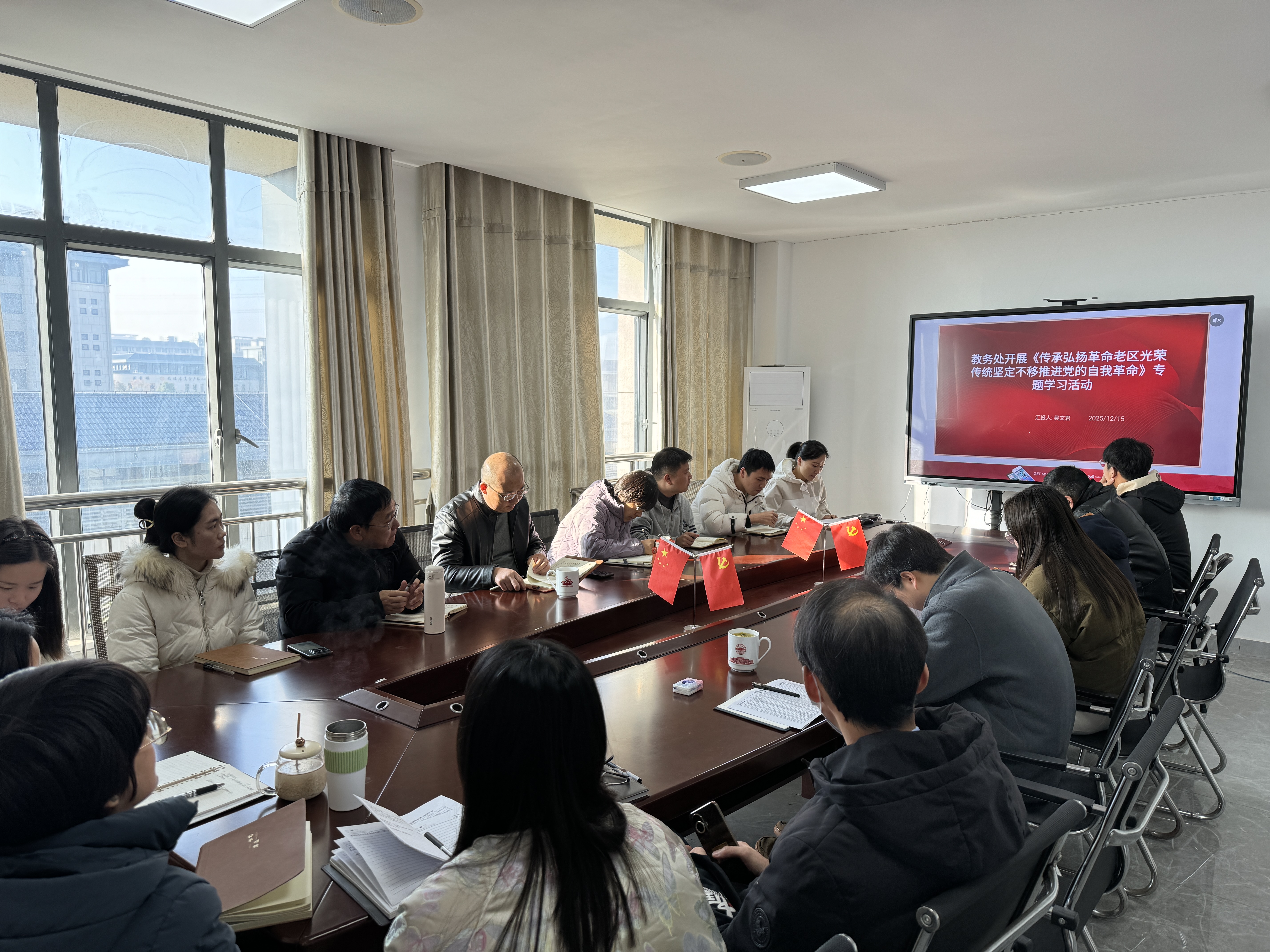为深入传承弘扬革命老区光荣传统,坚定不移推进党的自我革命,切实把红色精神融入教务管理工作,12月15日,教务处组织全体教职工开展《传承弘扬革命老区光荣传统坚定不移推进党的自我革命》专题学习活动。吴文君同志主讲,教务处全体人员参加学习。