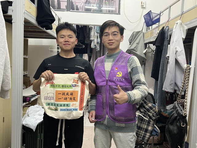 工作人员深入考研学子宿舍,将学院精心准备的考研祝福礼包递到每一位学子手中。礼包设计别具巧思,每一件物品都承载着对学子们的深切祝愿和实用关怀。其中,寓意“心想事成”的鲜橙,寄托了对学子们顺利如愿的美好期盼;旺仔牛奶与甜蜜奶糖,补充能量的好帮手;应对寒冷天气的暖宝宝贴,让备考之路多一份温暖。此外,还有配套齐全的实用文具礼包,陪伴学子们书写奋斗篇章。