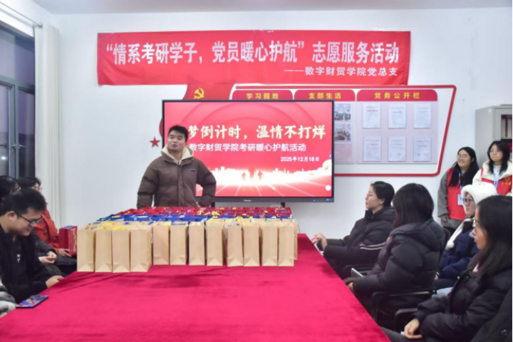 12月18日,数字财贸学院党总支在学生社区组织开展“情系考研学子,党员暖心护航”志愿服务活动,为即将参加硕士研究生招生考试的学子提供支持与鼓励。