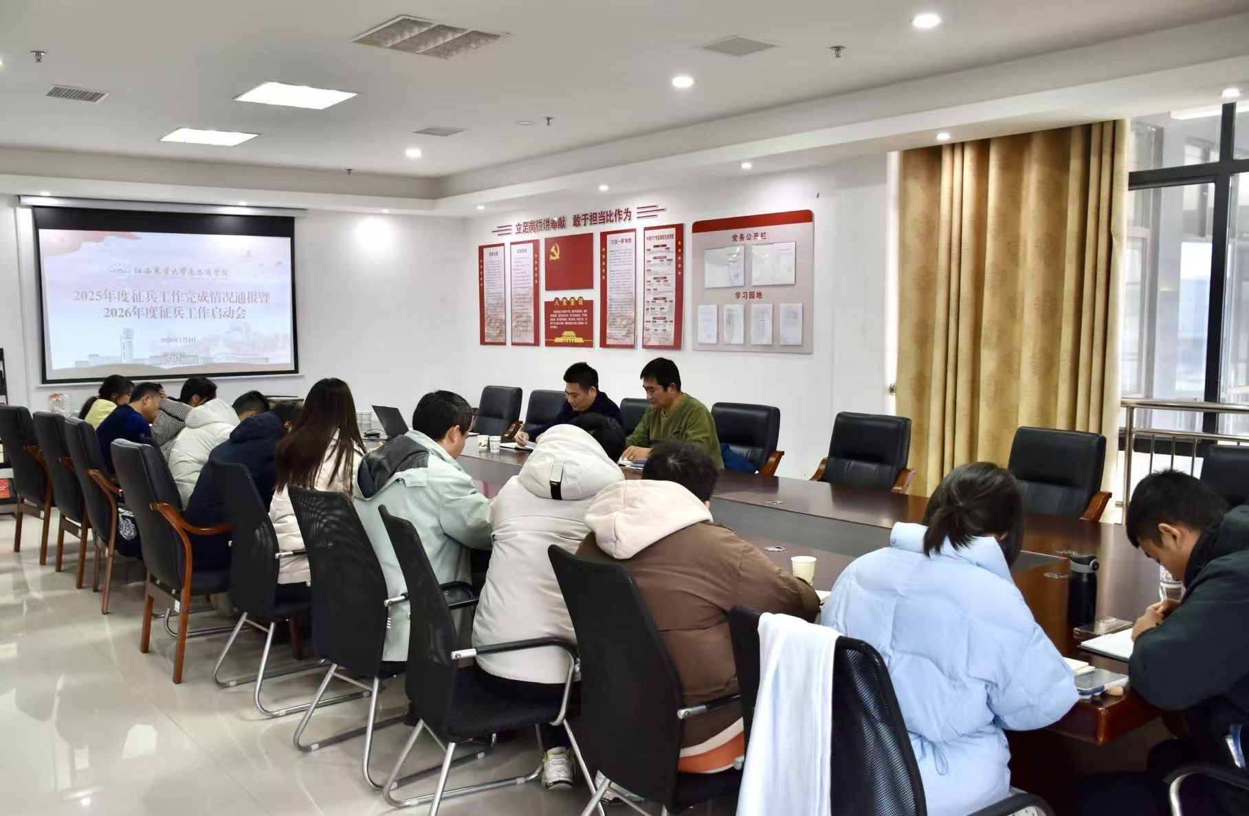 1月4日,学院在明道楼B411召开2026年度征兵工作启动会,深入学习贯彻党中央、国务院、中央军委关于新时代征兵工作的重要指示精神,全面部署本年度大学生征兵任务。副院长徐发亮、各二级学院征兵工作负责人员参加。