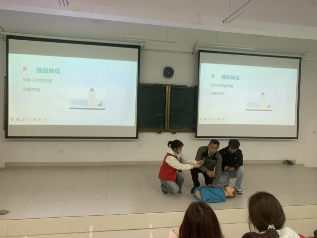 蔡步东主任围绕春季常见传染病特点、传播途径、学校防控措施等方面讲授春季传染病预防知识,并重点明确食堂、宿舍等校园重点公共场所的消毒规范,让大家掌握科学的传染病预防方法。卫任龙主任结合30多年心血管临床经验,传授心肺复苏、体外除颤器的使用方法等核心技能。在场师生认真听讲,积极参与现场实操演练,切实提升了师生健康防护和紧急救护能力。