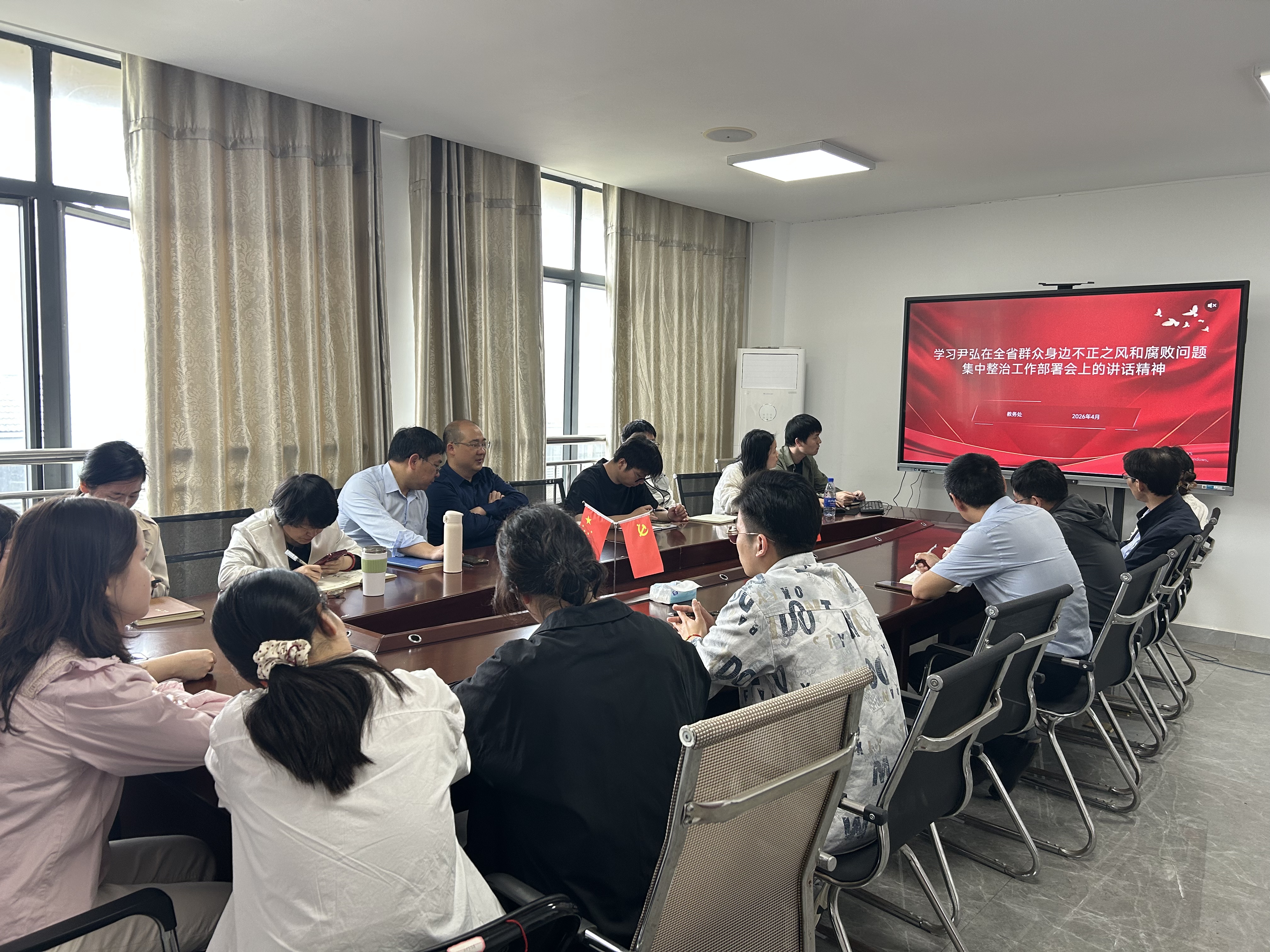 为深入贯彻落实全省群众身边不正之风和腐败问题集中整治工作部署会要求,强化教务处履职担当,筑牢廉洁从教防线,近日,教务处组织全体教职工专题学习省委书记尹弘在全省群众身边不正之风和腐败问题集中整治工作部署会上的重要讲话精神。