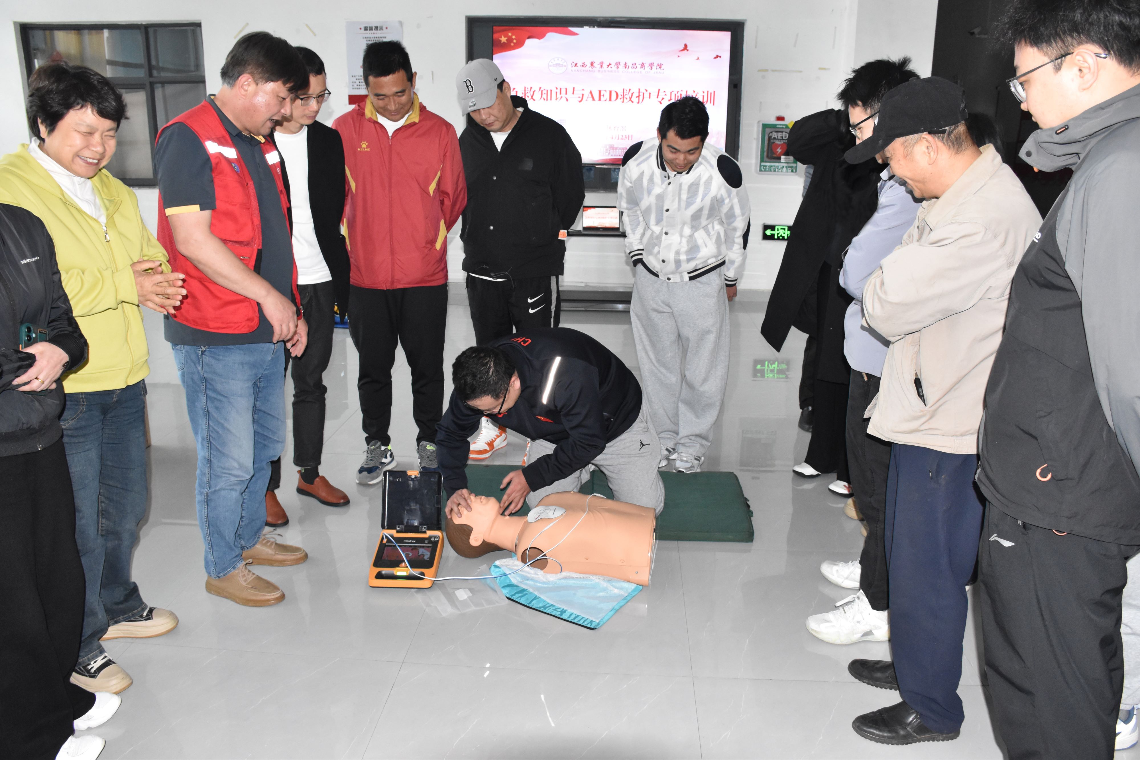 为贯彻落实学院《大学生体质提升专项行动实施方案》通知要求,切实增强师生运动风险防范意识与应急处置能力,4月23日,学院体育运动委员会在体育馆一楼大厅组织开展AED救护技能专项培训。本次培训分设教师专场与学生专场,共计130名师生参加,覆盖全体体育教师、各单位安全员、辅导员、校运动队队长、各二级学院体育部学生骨干及运动类社团负责人。