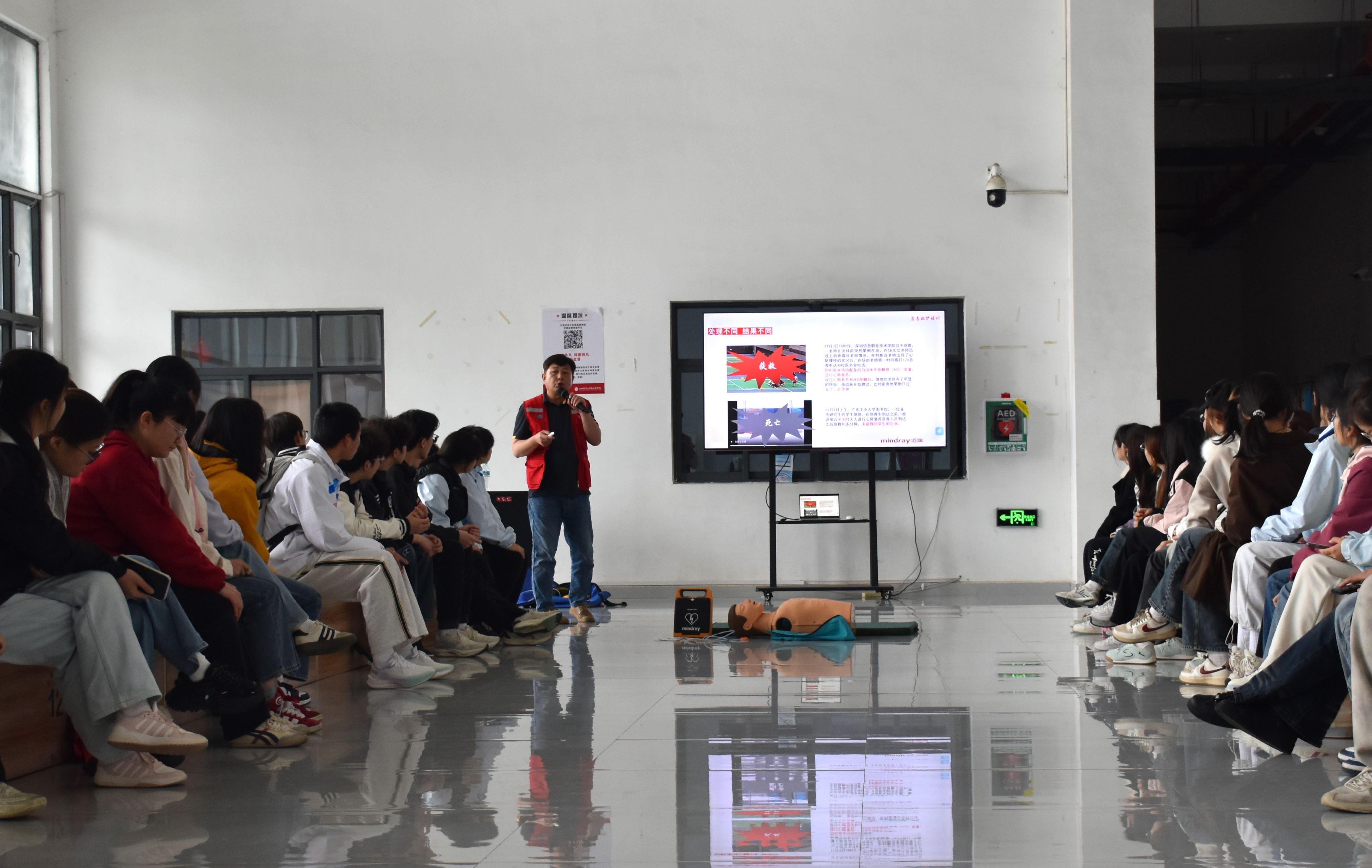 培训围绕急救基础知识与应急流程、成人心肺复苏(CPR)操作规范、自动体外除颤器(AED)使用方法及注意事项、模拟实操练习四个模块展开。授课老师结合校园运动场景中的真实风险案例,系统讲解了心脏骤停的识别判断、呼救流程、胸外按压与人工呼吸的操作要点,并重点演示了AED设备从开机、贴片到电击除颤的全流程操作。