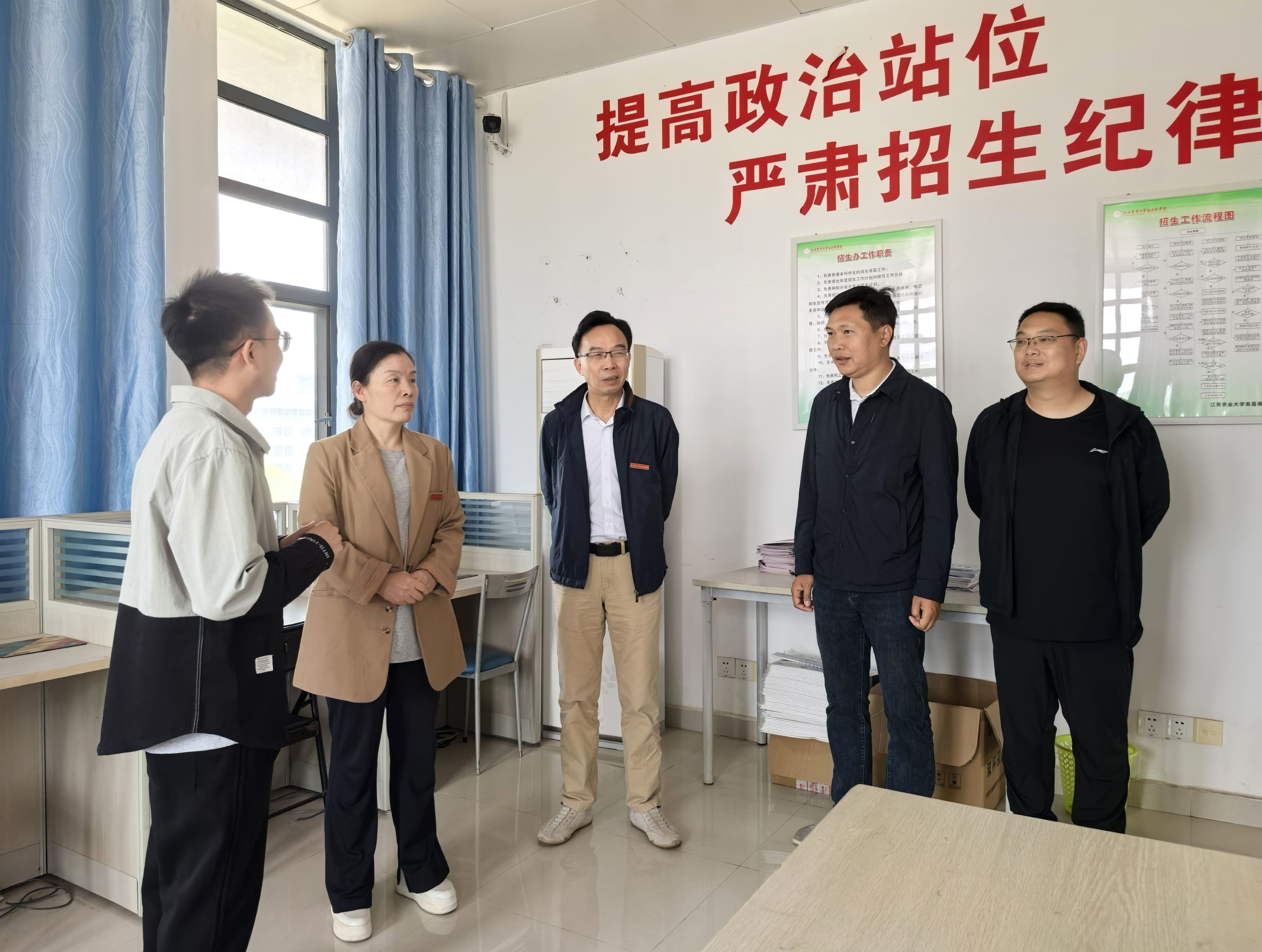 为确保招生工作阳光透明、规范有序,4月27日上午,学院党委书记黎敏、院长胡国良、党委副书记李海峰、纪委书记邱波一行检查指导2026年专升本招生录取工作,详细了解阅档审核、系统操作及考生服务进展。